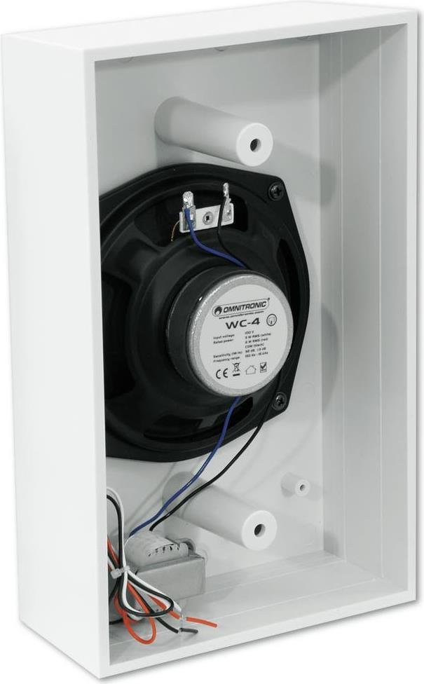 Omnitronic WC-4 ELA-WandlautsprecherWandlautsprecherWandlautsprecher100-V-Technik mit BreitbandlautsprecherWeißes Kunststoffgehäuse ohne RückwandAnschluss über offene KabelendenFür Beschallungsanlagen im InnenbereichTechnische Daten: Gewicht: 1.1 kgProduktabmessung, Breite: 280 mmWeitere technische Daten: Eingangsspannung: 100 VKomponenten: 13 cm Lautsprecher (5)Nennleistung: 3 W RMS (weiß)6 W RMS (rot)COM (schwarz)Empfindlichkeit (1 W, 1 m): 92 dB, ±3 dBFrequenzbereich: 150 Hz - 15 kHzMaße (H x B x T): 268 x 168 x 78 mmGewicht: 1 kg\"\"