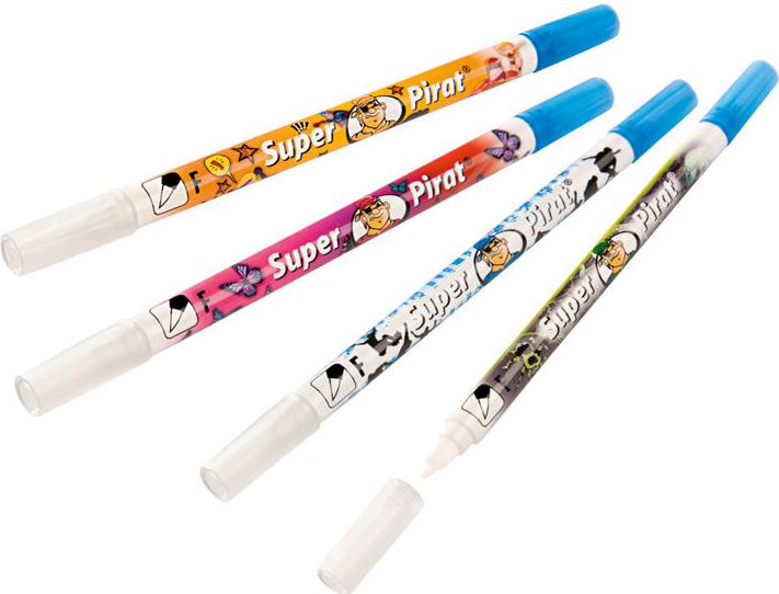 Mit dem Super Pirat können Schreibfehler und Tintenflecken ganz leicht entfernt werden. Mit der Löschspitze wird der Fehler oder Fleck mühelos unsichtbar gemacht.