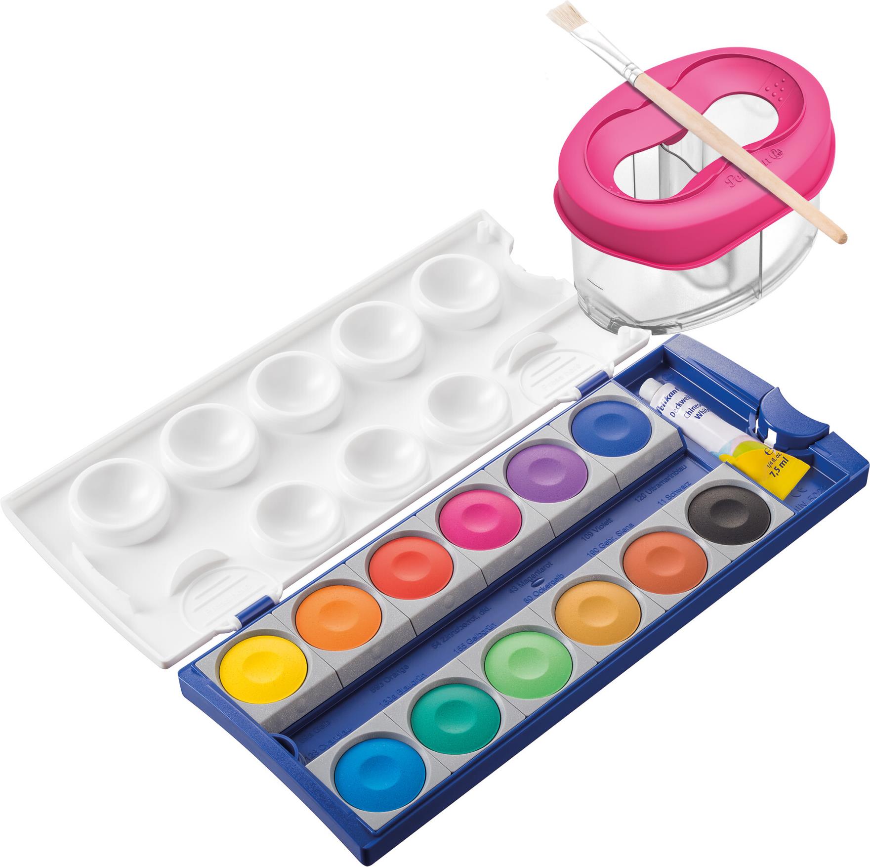 Zwei Wasserkammern und ein Fach für Pinsel. Transparente Optik zum Anzeigen des Wasserstandes. Auslaufschutz. Ansteckbar an Space+ und ...