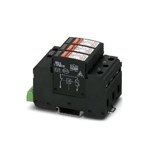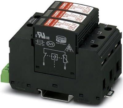 Überspannungsableiter für 4-Leiter-Stromversorgungssysteme (L1, L2, L3, PEN), bestehend aus Basiselement mit FM-Kontakt und Schutzsteckern, zur Montage auf NS ...