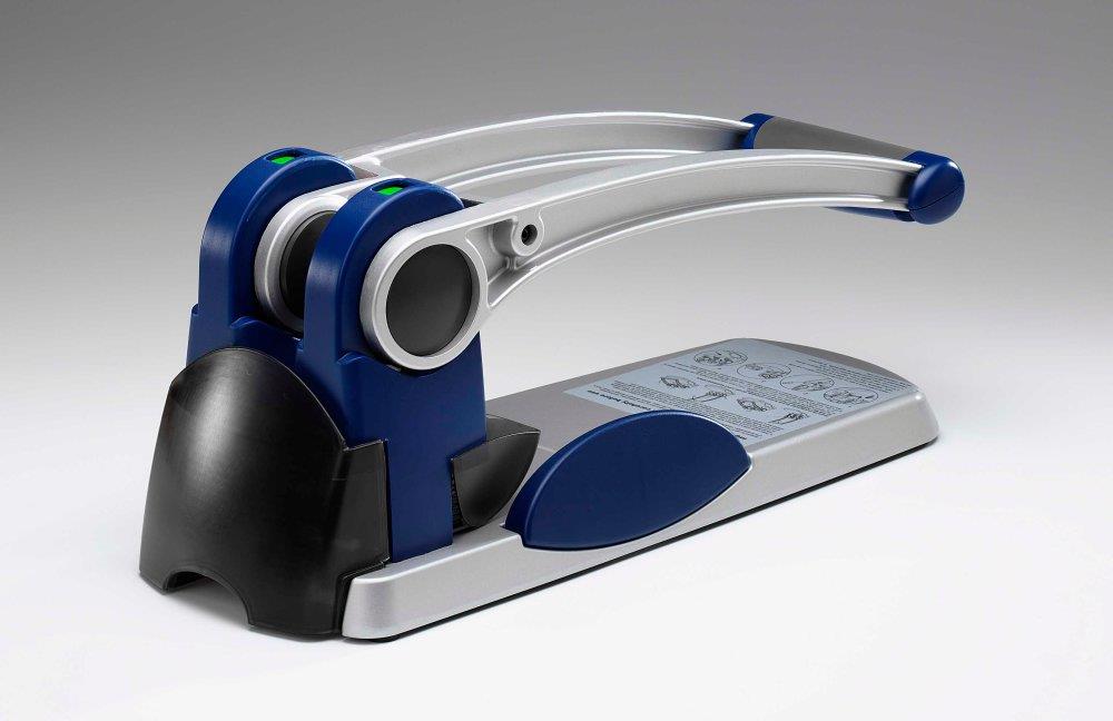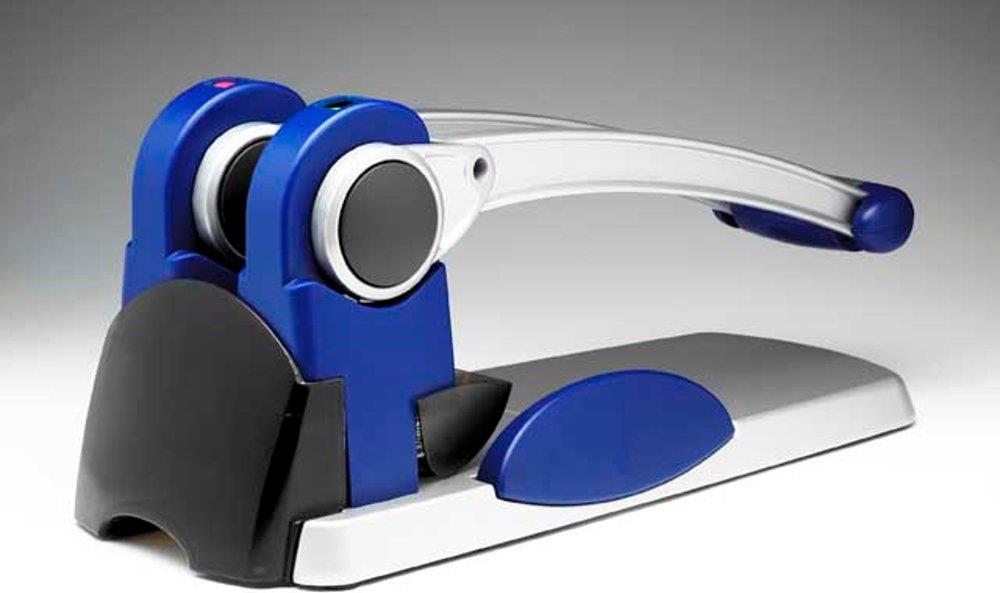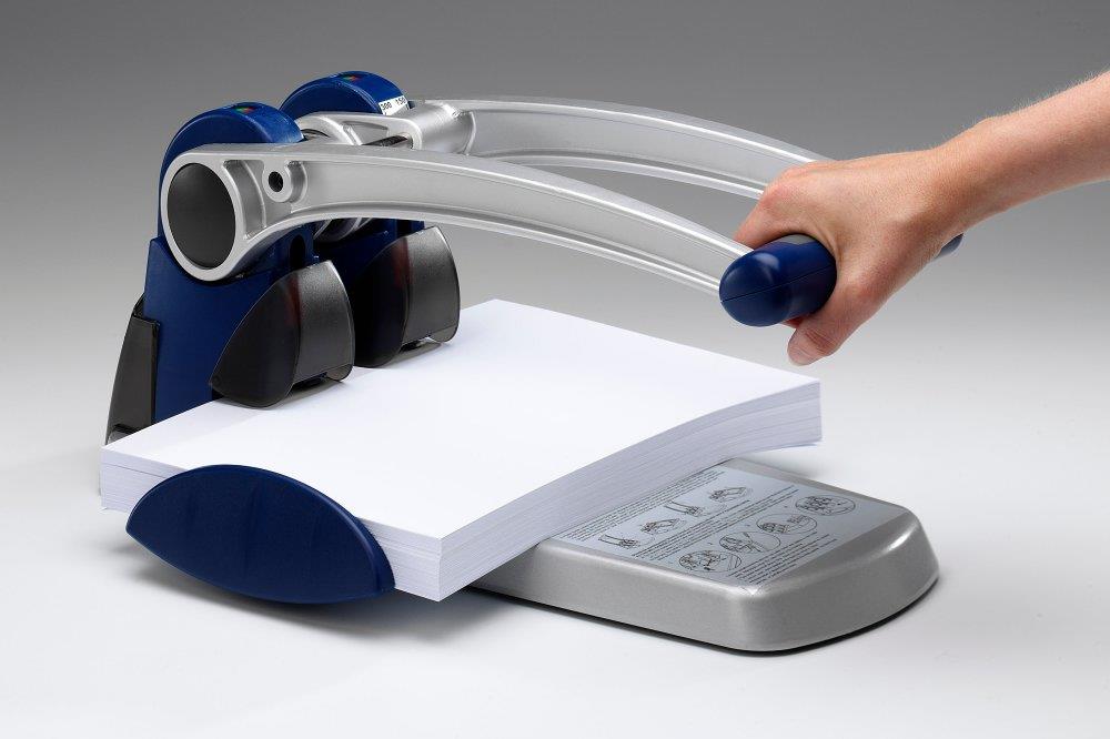 Der robuste Zweifachlocher aus Metall (Heavy Duty) besitzt scharfe Hohlstifte und bietet einen Stanzleistung von circa 300 Blatt. Aufgrund seiner größeren Hebelwirkung und innovativen Mechanik können Sie mit nur einem Handgriff 150 Blatt stanzen. Für 150-300 Blatt sind nur zwei Bewegungen erforderlich.