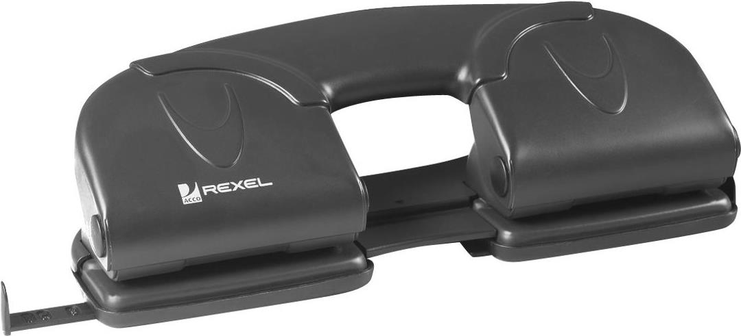 REXEL Vierfachlocher V412, Stanzleistung: 12 Blatt, schwarz aus Metall, mit 80 mm Lochung, mit Anschlagschiene für A4 (08309)
