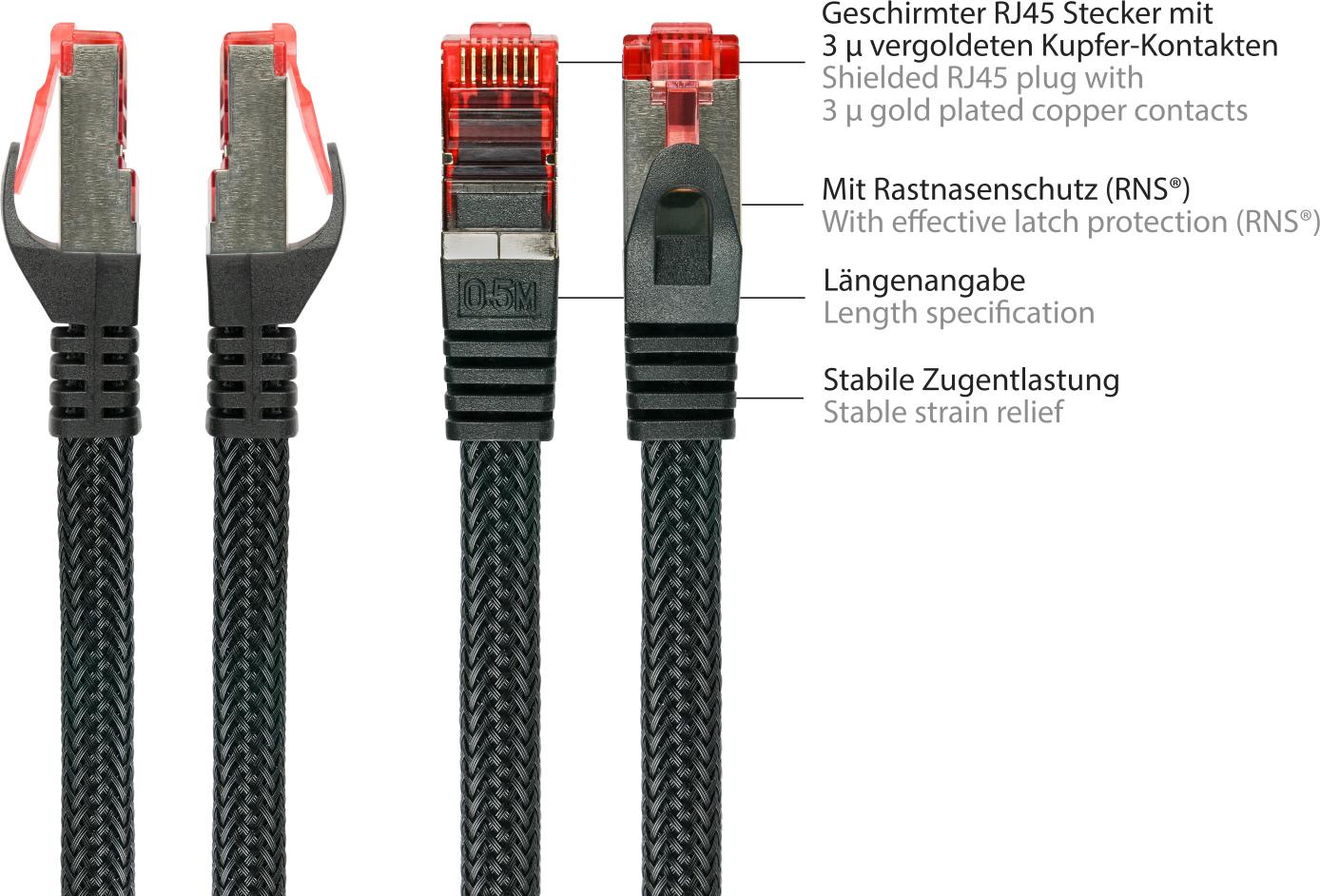 RNS® Patchkabel mit Rastnasenschutz und Nylongeflecht, Cat. 6, S/FTP, PiMF, PVC, 250MHz, OFC, schwarz, 1m, PYTHON® Series (8063PY-010S)