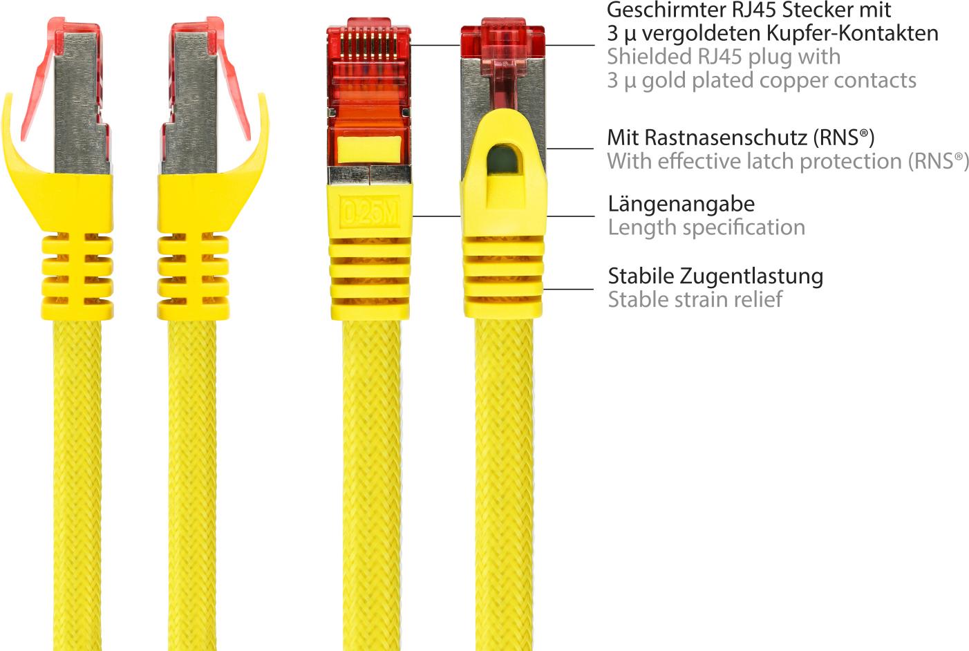 RNS® Patchkabel mit Rastnasenschutz und Nylongeflecht, Cat. 6, S/FTP, PiMF, PVC, 250MHz, OFC, gelb, 7,5m, PYTHON® Series (8063PY-075Y)