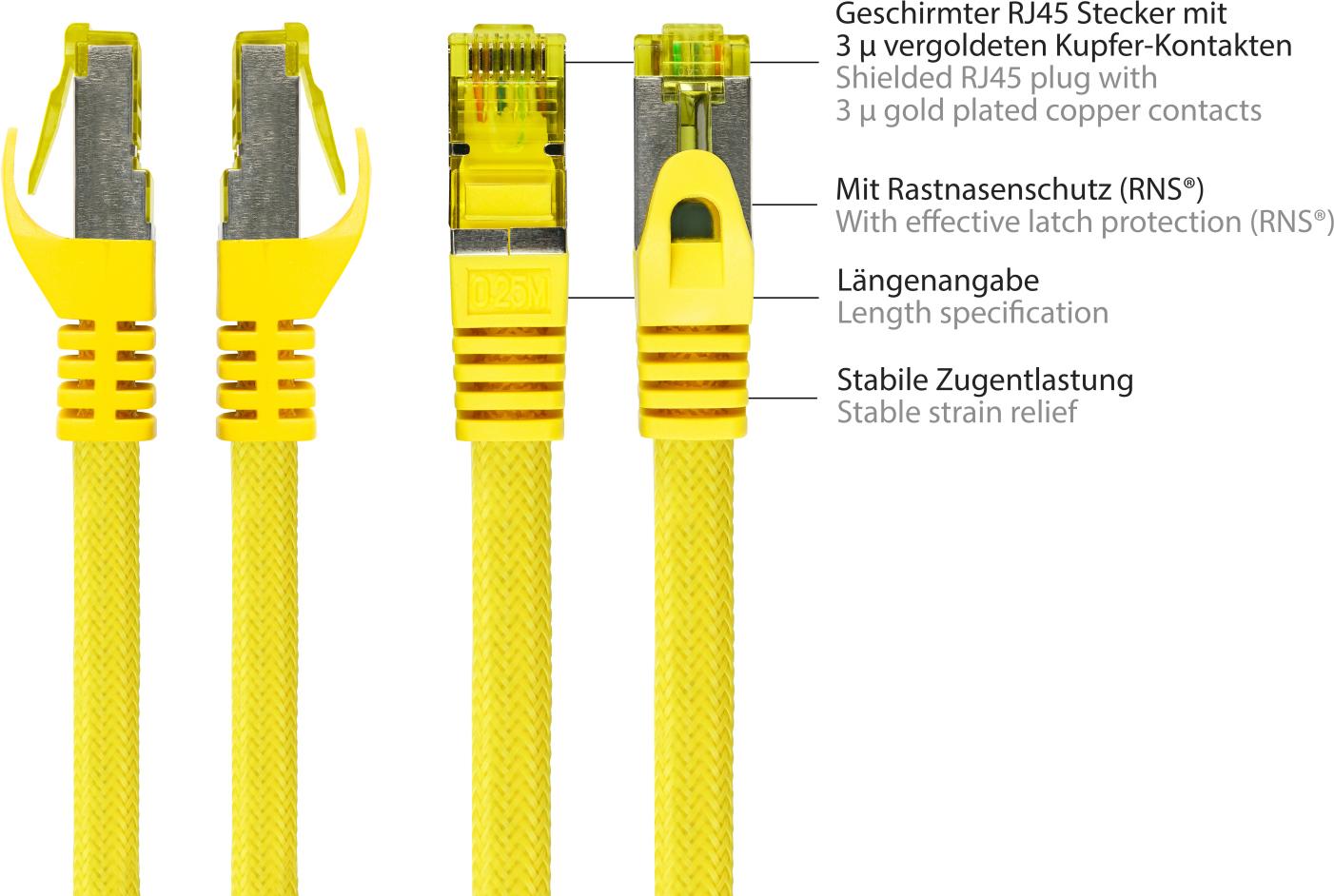 Python® Series RJ45 Patchkabel mitCat.7 Rohkabel, Rastnasenschutz (RNS®) und Nylongeflecht, S/FTP, PiMF, halogenfrei, 600MHz, OFC, gelb, 10m (8070PY-100Y)