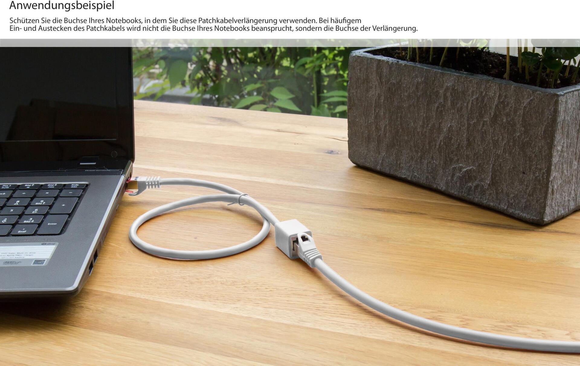 Diese RJ45 Patchkabelverlängerung ist mit allen herkömmlichen Geräten mit RJ45 Schnittstelle verwendbar, wie zum Beispiel, Computer, Notebook, DSL-Modem, Router, Switch, Spielekonsole, Fernseher und vielen mehr. Das Patchkabel ist doppelt geschirmt mit einer zusätzlichen Schirmung der Adernpaare. Somit ist es Gigabitfähig, passend zu Ihrem schnellen DSL Anschluss. Das Patchkabel ist natürlich abwärtskompatibel zu alten Geräten und Installationen der Kategorien Cat. 5 und Cat. 5e. RJ45 Stecker mit RNS: Der RJ45 Stecker besitzt einen Rastnasenschutz (RNS). Dies verhindert ein Wegknicken der Rastnase auf der Oberseite des Steckers. Die Adernpaare bestehen zu 99,99% aus sauerstofffreiem Kupfer (OFC). Dies ermöglicht eine gesteigerte Signalübertragung des Kabels.Produkttext[/head]Der letzte Meter: Sie haben bereits ein Patchkabel in Ihren Räumen verlegt, beispielsweise hinter Regalen, unter Laminat oder hinter Fußleisten. Bisher hat die Länge zu Ihrem Gerät gereicht, doch nach Umstellung der Möbel reicht das vorhandene Kabel nun nicht mehr. Ihnen fehlt der \"letzte Meter\". Anstatt nun das gesamte Patchkabel zu ersetzen, schließen Sie einfach eine Patchkabelverlängerung in der für Sie passenden Länge bis zu Ihrem Endgerät an.Schutz Ihres Gerätes: Schützen Sie beispielsweise die Buchse Ihres Notebooks, in dem Sie diese Patchkabelverlängerung verwenden. Bei häufigem Ein- und Ausstecken des Patchkabels wird nicht die Buchse Ihres Notebooks beansprucht, sondern die Buchse der Verlängerung. Somit entfällt eine mögliche kostspielige Reparatur Ihres Notebooks.[head]Hauptmerkmale