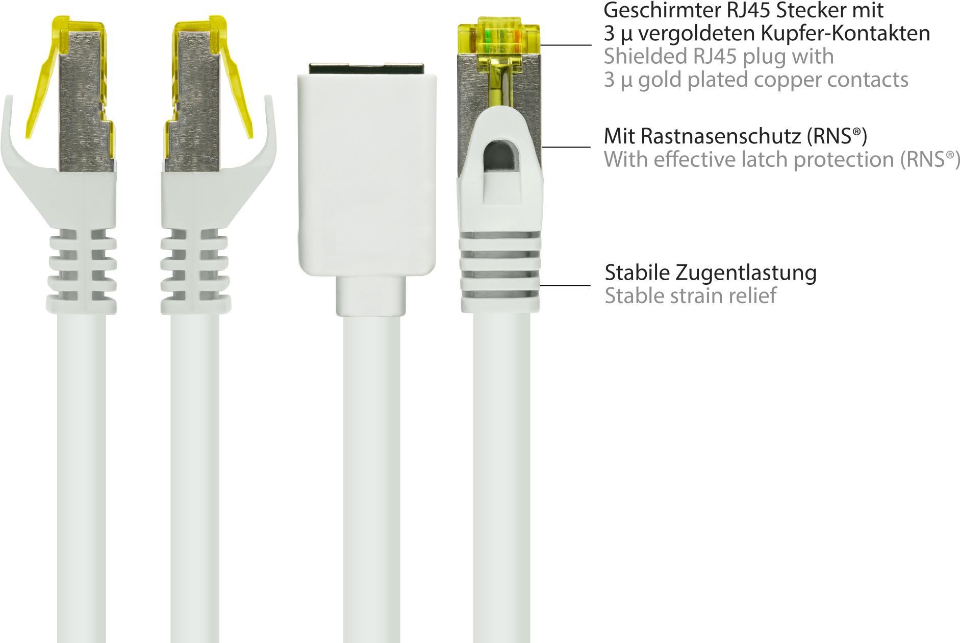 RJ45 Patchkabelverlängerung mitCat.7 Rohkabel und Rastnasenschutz (RNS®), S/FTP, PiMF, halogenfrei, 600MHz, OFC, weiß, 2m, Good Connections® (8070VR-020W)