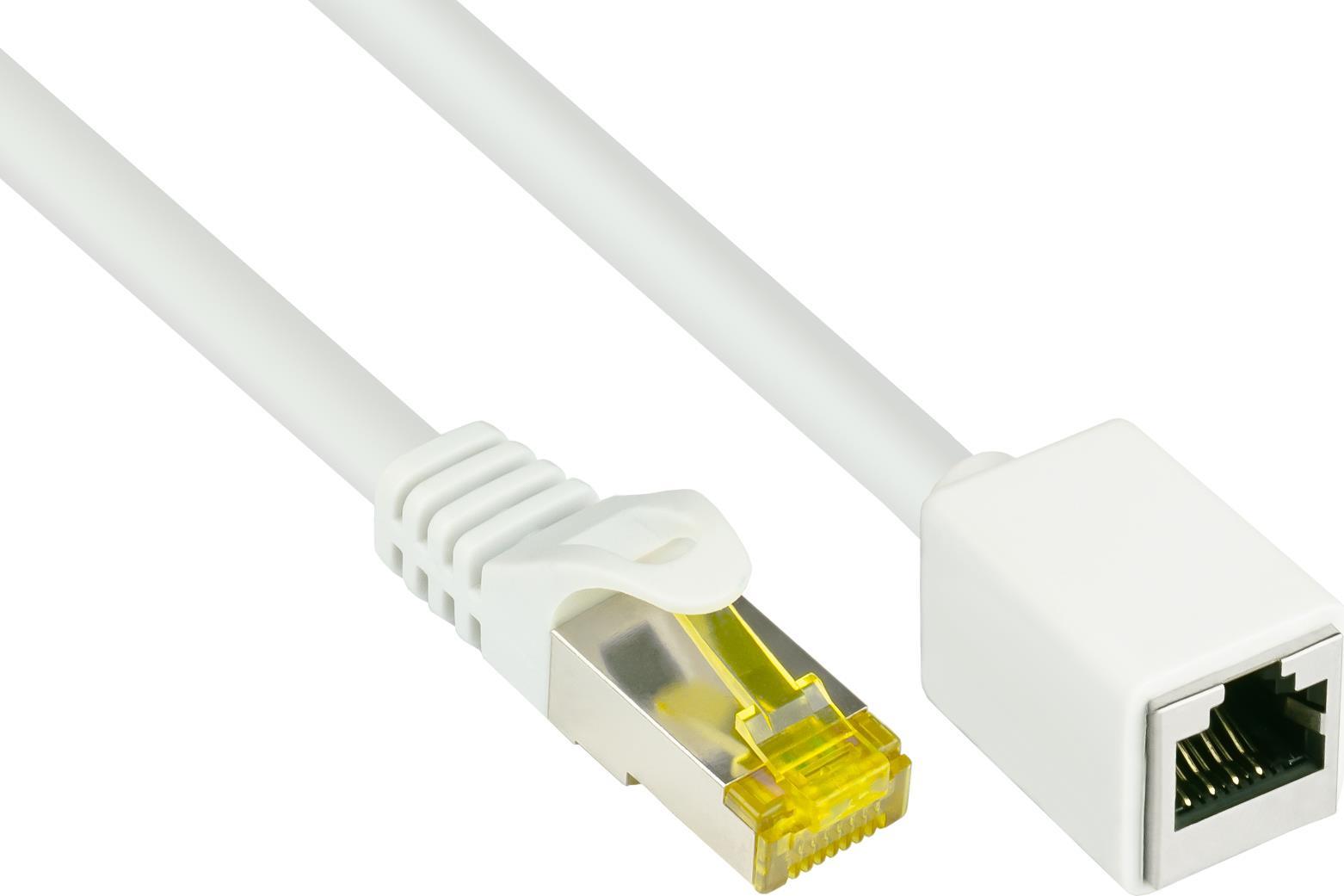 RJ45 Patchkabelverlängerung mitCat.7 Rohkabel und Rastnasenschutz (RNS®), S/FTP, PiMF, halogenfrei, 600MHz, OFC, weiß, 5m, Good Connections® (8070VR-050W)