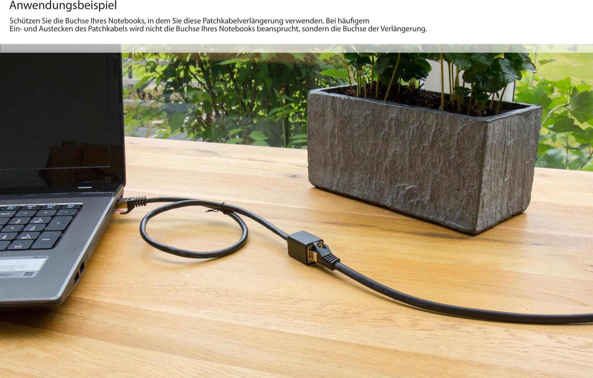 Diese RJ45 Patchkabelverlängerung ist mit allen herkömmlichen Geräten mit RJ45 Schnittstelle verwendbar, wie zum Beispiel, Computer, Notebook, DSL-Modem, Router, Switch, Spielekonsole, Fernseher und vielen mehr. Das Patchkabel ist doppelt geschirmt mit einer zusätzlichen Schirmung der Adernpaare. Somit ist es 10-Gigabitfähig, passend zu Ihrem schnellen DSL Anschluss. Das Patchkabel ist natürlich abwärtskompatibel zu alten Geräten und Installationen der Kategorien Cat. 5, Cat. 5e und Cat. 6. RJ45 Stecker mit RNS: Der RJ45 Stecker besitzt einen Rastnasenschutz (RNS). Dies verhindert ein Wegknicken der Rastnase auf der Oberseite des Steckers. Die Adernpaare bestehen zu 99,99% aus sauerstofffreiem Kupfer (OFC). Dies ermöglicht eine gesteigerte Signalübertragung des Kabels.Produkttext[/head]Anwendungsgebiete:Der letzte Meter: Sie haben bereits ein Patchkabel in Ihren Räumen verlegt, beispielsweise hinter Regalen, unter Laminat oder hinter Fußleisten. Bisher hat die Länge zu Ihrem Gerät gereicht, doch nach Umstellung der Möbel reicht das vorhandene Kabel nun nicht mehr. Ihnen fehlt der \"letzte Meter\". Anstatt nun das gesamte Patchkabel zu ersetzen, schließen Sie einfach eine Patchkabelverlängerung in der für Sie passenden Länge bis zu Ihrem Endgerät an.Schutz Ihres Gerätes: Schützen Sie beispielsweise die Buchse Ihres Notebooks, in dem Sie diese Patchkabelverlängerung verwenden. Bei häufigem Ein- und Ausstecken des Patchkabels wird nicht die Buchse Ihres Notebooks beansprucht, sondern die Buchse der Verlängerung. Somit entfällt eine mögliche kostspielige Reparatur Ihres Notebooks.Eigenschaften:Diese RJ45 Patchkabelverlängerung ist mit allen herkömmlichen Geräten mit RJ45 Schnittstelle verwendbar, wie zum Beispiel, Computer, Notebook, DSL-Modem, Router, Switch, Spielekonsole, Fernseher und vielen mehr. Das Patchkabel ist doppelt geschirmt mit einer zusätzlichen Schirmung der Adernpaare. Somit ist es 10-Gigabitfähig, passend zu Ihrem schnellen DSL Anschluss. Das Patchkabel ist natürlich abwärtskompatibel zu alten Geräten und Installationen der Kategorien Cat.5, Cat.5e und Cat. 6. RJ45 Stecker mit RNS®: Der RJ45 Stecker besitzt einen Rastnasenschutz (RNS®). Dies verhindert ein Wegknicken der Rastnase auf der Oberseite des Steckers. Die Adernpaare bestehen zu 99,99% aus sauerstofffreiem Kupfer (OFC). Dies ermöglicht eine gesteigerte Signalübertragung des Kabels.[head]Hauptmerkmale