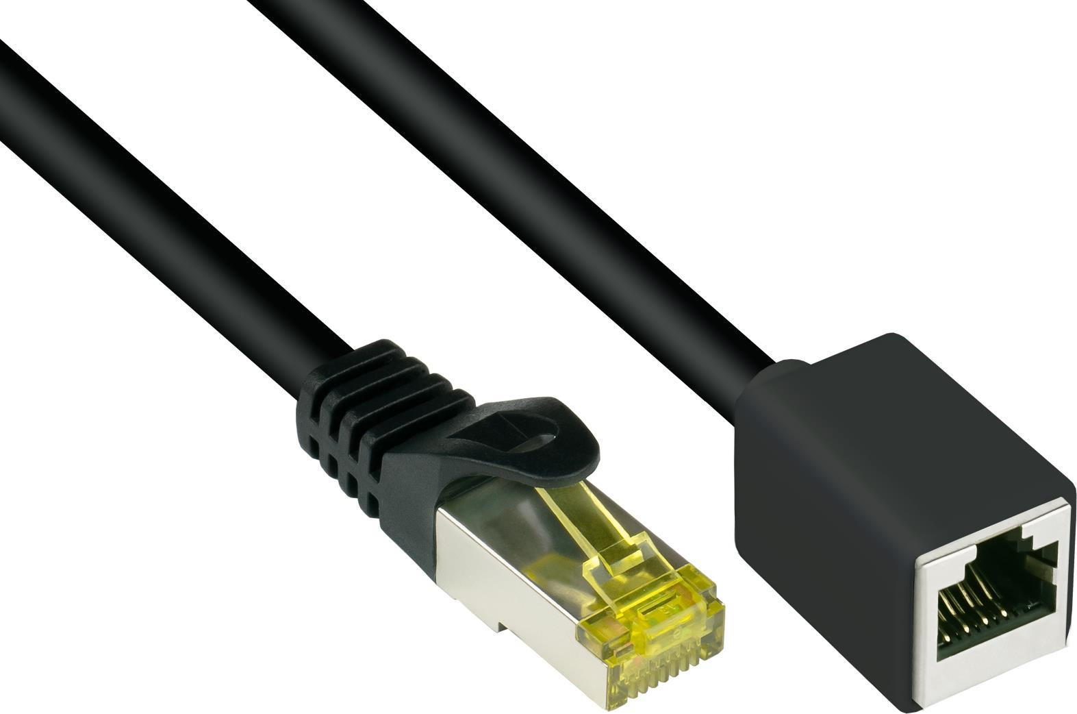 RJ45 Patchkabelverlängerung mitCat.7 Rohkabel und Rastnasenschutz (RNS®), S/FTP, PiMF, halogenfrei, 600MHz, OFC, schwarz, 10m, Good Connections® (8070VR-100S)