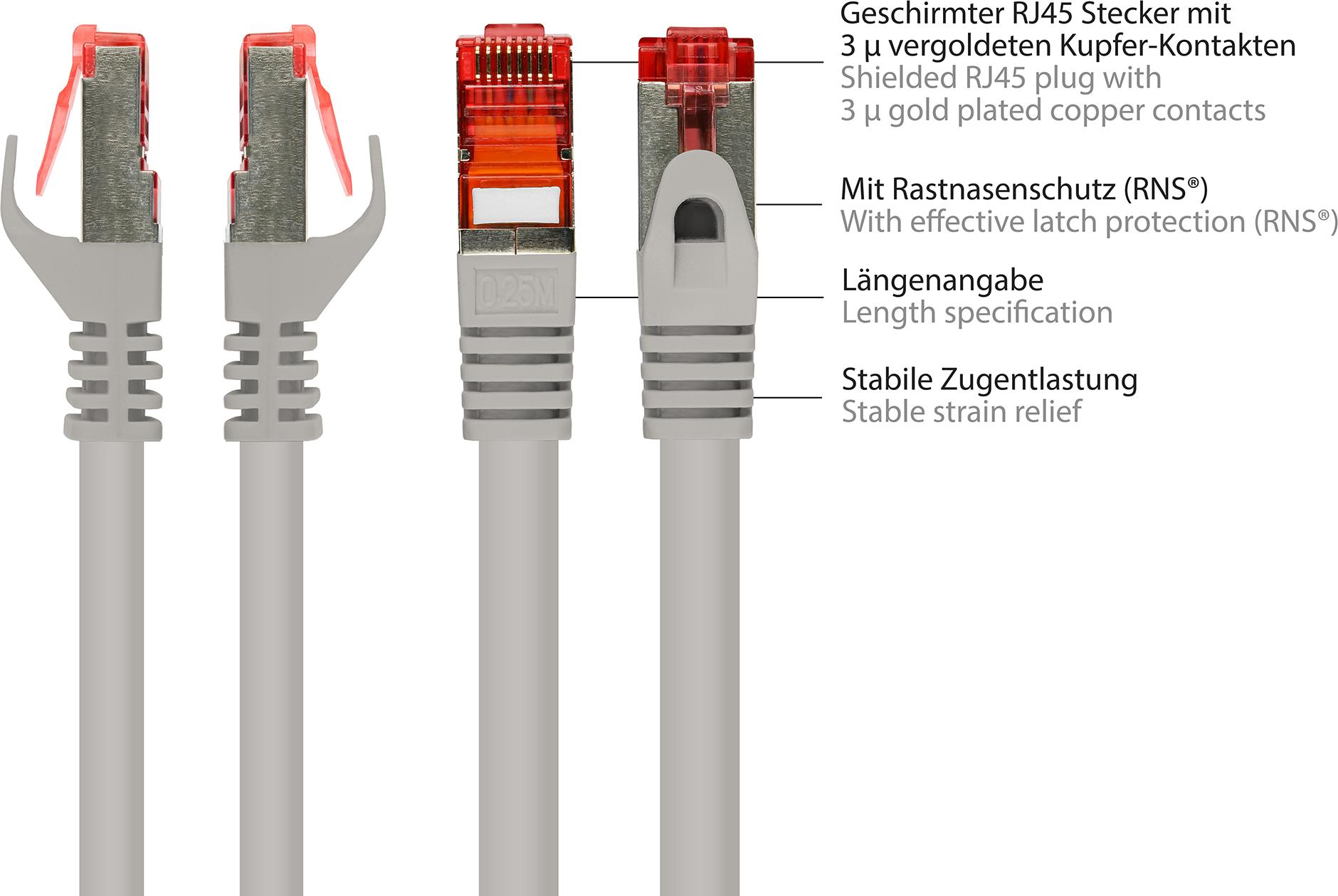 • RNS® Patchkabel mit Rastnasenschutz, Cat. 6, S/FTP, PiMF, PVC, 250MHz, grau, 10m, Good Connections (8060-100)