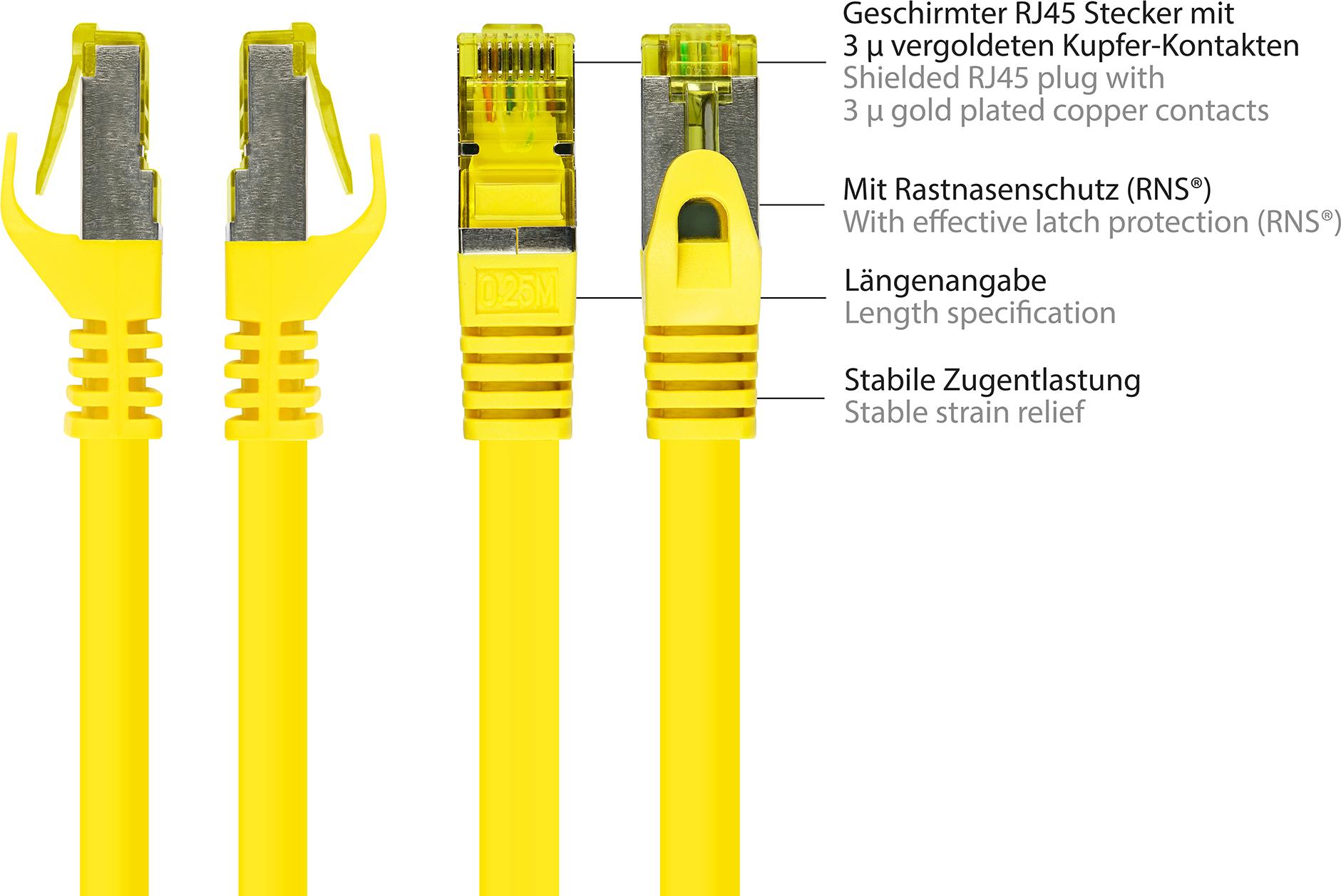 RJ45 Patchkabel mitCat.7 Rohkabel und Rastnasenschutz (RNS®), S/FTP, PiMF, halogenfrei, 600MHz, OFC, gelb, 0,5m, Good Connections® (8070R-005Y)