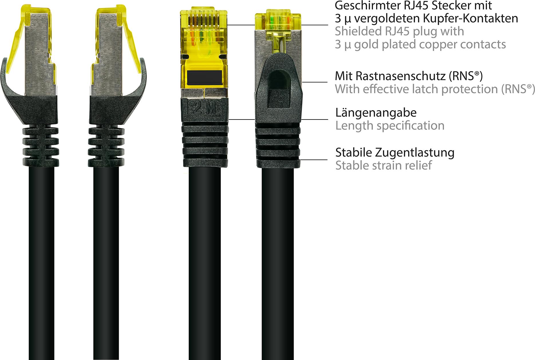 RJ45 Patchkabel mitCat.7 Rohkabel und Rastnasenschutz (RNS®), S/FTP, PiMF, halogenfrei, 600MHz, OFC, schwarz, 2m, Good Connections® (8070R-020S)