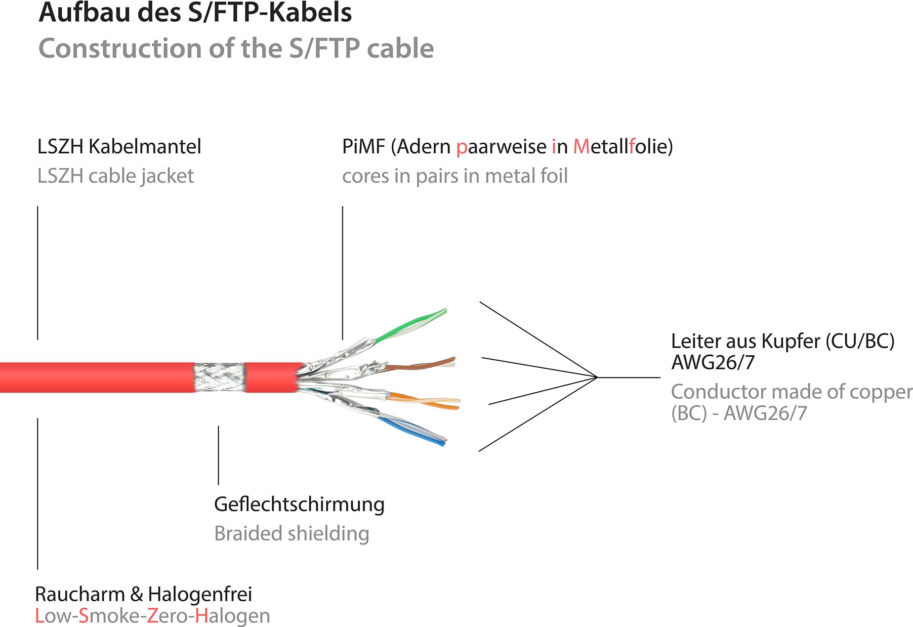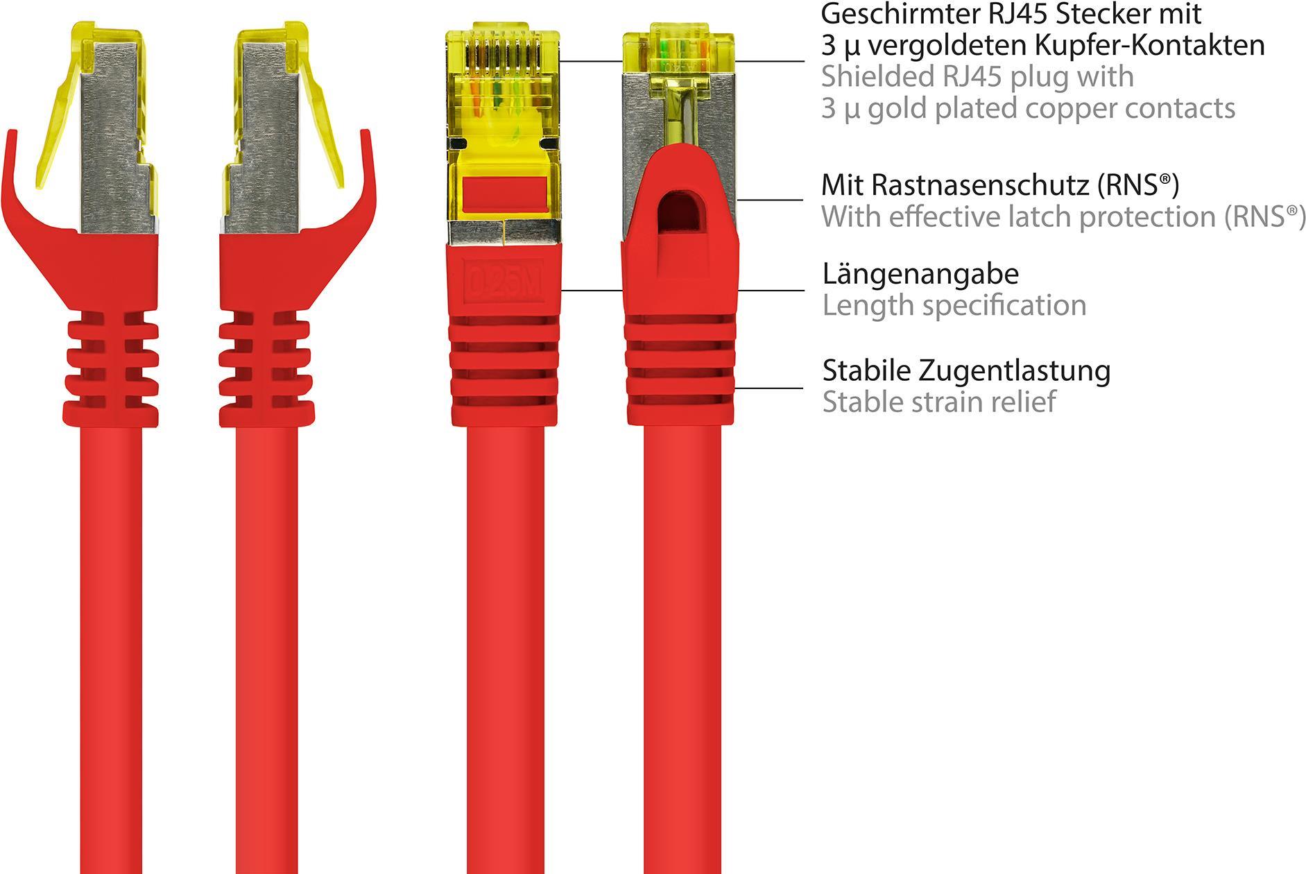 RJ45 Patchkabel mitCat.7 Rohkabel und Rastnasenschutz (RNS®), S/FTP, PiMF, halogenfrei, 600MHz, OFC, rot, 5m, Good Connections® (8070R-050R)