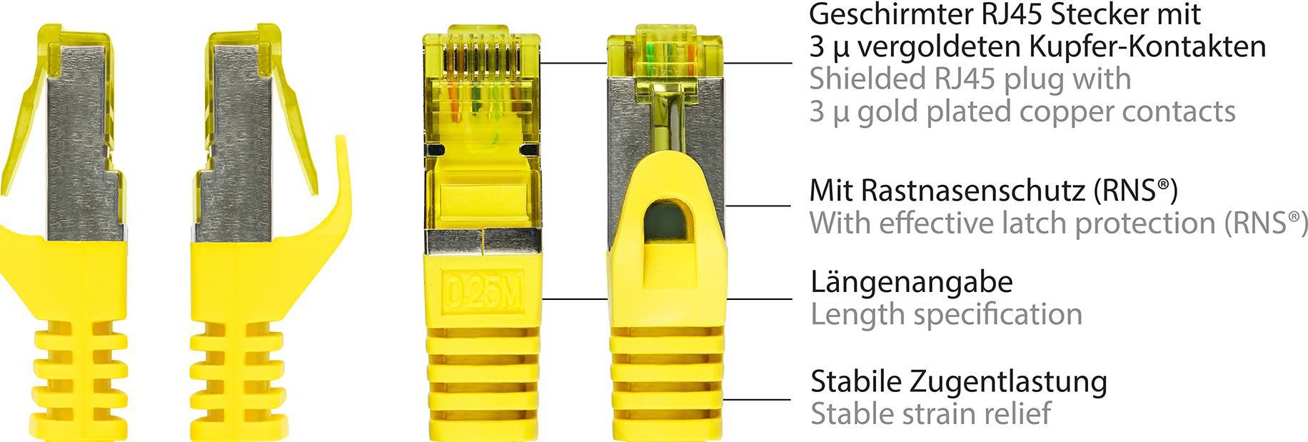 RJ45 Patchkabel mitCat.7 Rohkabel und Rastnasenschutz (RNS®), S/FTP, PiMF, halogenfrei, 600MHz, OFC, gelb, 20m, Good Connections® (8070R-200Y)