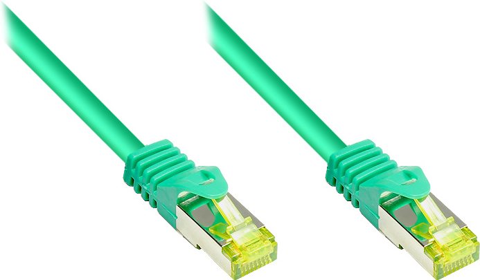 RJ45 Patchkabel mitCat.7 Rohkabel und Rastnasenschutz (RNS®), S/FTP, PiMF, halogenfrei, 600MHz, OFC, grün, 0,15m, Good Connections® (8070R-002G)