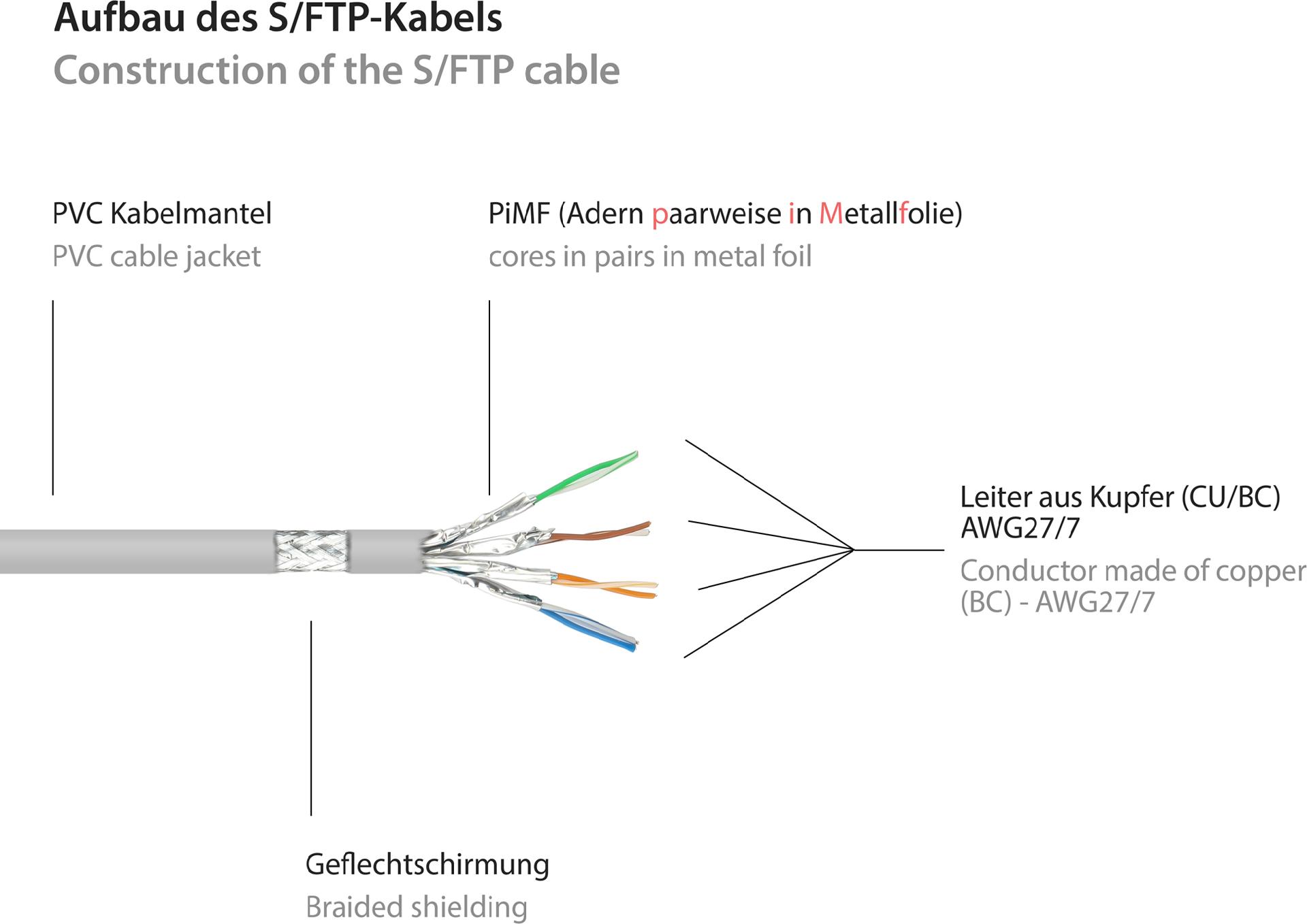 Patchkabel von Good Connections® mit effektivem Rastnasenschutz (RNS). Verhindert das Wegknicken der Rastnase auf dem Patchkabelstecker. So gehören abgebrochene Rastnasen der Vergangenheit an! - Mit Rastnasenschutz (RNS) - 250MHz - Kabel nach Cat. 6 Vorgaben gefertigt - RJ45-Stecker beidseitig - S/FTP-Kabel (Schirmung Folie + Geflecht) - PIMF (Adern paarweise in Metallfolie) - Kupferadern - Vergoldete Kontaktflächen - Für diverse Geräte geeignet wie Patchfeld, Patchpanel, Switch, Router, Modem mit RJ45 Anschluss