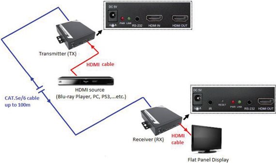 • Die Reichweite des HDMI Signals kann mit Hilfe der HDMI Verlängerung und eines Kat.5e oder Kat.6 Kabels um bis zu 100 m verlängert werden