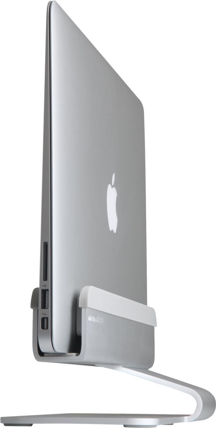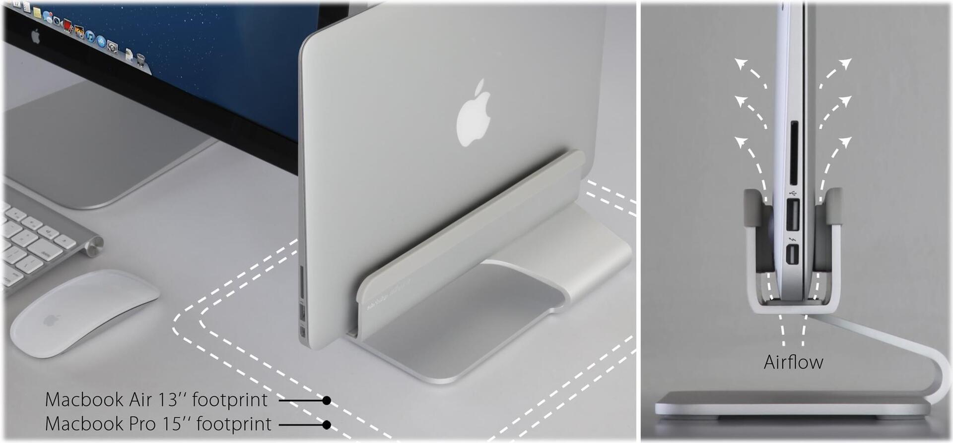 Der mTower Standfuß für MacBook, MacBook Pro (auch Retina) sowie MacBook Air benötigt nur ein Drittel der regulären Stellfläche des eigentlichen MacBooks. Sein solider und fließender Bau schmeichelt jedem Schreibtisch.