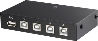 Renkforce 4 Port mechanischer USB 2.0-UmschalterBietet vier Rechnern Zugriff auf ein gemeinsames USB-Gerät (z.B. Drucker)Mehrere USB-Geräte anschließbar über zusätzlichen USB-HubUmschaltung wahlweise über Taste oder Tastatur-Kommando (Hotkey)Kein zusätzliches Netzteil nötig (Bus-powered)Ständiges Umstecken von USB-Geräten zwischen PCs raubt Zeit und Nerven. Vor allem, wenn die USB-Ports schlecht zu erreichen sind. Der mechanische USB-Umschalter von Renkforce ermöglicht es ein USB Gerät (z.B. Drucker, Scanner) zwischen vier Computern zu teilen. So erhalten 4 PCs einen gemeinsamen Zugriff auf nur ein USB-Gerät.Durch USB-Hub noch mehr USB-Geräte umschaltbarBei Anschluss eines USB-Hubs am Umschalter können sogar noch mehr USB-Geräte gemeinsam genutzt werden. Die Anzahl der USB-Geräte erhöht sich somit um die Anzahl der USB-Ports am Hub.High-Speed USB 2.0Dank USB 2.0 besitzt der Umschalter Datenübertragungsraten von bis zu 480 Mbit/s. Er ist zudem abwärtskompatibel zu USB 1.1-Geräten.Kein Netzteil nötigDer USB-Umschalter ist bus-powered, dies bedeutet, die Spannungsversorgung erfolgt über Ihren PC oder Notebook. Sie benötigen hierzu kein zusätzliches Netzteil. Ausstattung: Abwärtskompatibel zu USB 1.1Technische Daten: Anzahl Ausgänge: 1 xAnzahl Eingänge: 4 xAnzahl Umschaltbarer PCs: 4Farbe: SchwarzGewicht: 162 gProduktabmessung, Breite: 120 mmProduktabmessung, Höhe: 77 mmProduktabmessung, Tiefe: 24 mmSchnittstellen Ausgang (Computer/Multimedia): USB 2.0Schnittstellen Eingang (Computer/Multimedia): USB 2.0Stromversorgung (LOV): über USBUmschalter/Verteiler-Typ (Kategorisierung): USB 2.0-UmschalterUmschaltfunktion: ManuellWeitere technische Daten: Rechneranschlüsse: 4x USB Typ BGeräteanschlüsse: 1x USB Typ A Betriebstemperatur: 0 bis 40 ° CLagertemperatur: 0 bis 40 ° CLieferumfang: USB-Umschalter, Bedienungsanleitung.Systemvoraussetzungen: ab Windows® 98SE, Mac OS XHinweis: Sie benötigen zum Betrieb je Rechner und USB-Gerät noch ein USB-Kabel Typ A/B (nicht im Lieferumfang).