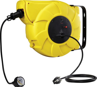 Kabelbox für Wandmontage 22 mMit Überhitzungsschutz22 m langes KabelKabelaufrollautomatikDie Kabelbox von Renkforce wird mit dem Haltebügel direkt an die Wand oder Decke geschraubt. Das 22 m lange Kabel wird über den Rückholmechanismus in die Box zurückgezogen. Die kabelbox ist bis 180° schwenkbar und verfügt über 2 m Anschlusskabel. Das robuste Kunststoffgehäuse schütz das kabel und der Überhitzungsschutz sowie die Steckdose mit Kinderschutz sorgen für extreme Sicherheit.Technische Daten: Anschluss-Leistung: 3000 WAnschlusstyp A (bzw. Eingänge): Schutzkontakt-SteckerAnschlusstyp B (bzw. Ausgänge): Schutzkontakt-KupplungBelastbarkeit (aufgerollt/abgerollt): 1000/3000 WEinsatzort: InnenbereichFarbe: GelbGewicht: 6.5 kgKabel-Besonderheiten: inkl. AufrollerKabel-Typ nach DIN/VDE: H05VV-F 3G 1,5 mm²Kabelfarbe: SchwarzKabellänge: 22.00 mKabeltrommel-Typ (Kategorisierung): KabeltrommelMaterial (LOV): KunststoffNenn-Eingangsspannung: 230 VSchutzart: IP20Steckdosen-Anzahl: 1Stecker-Ausführung: einseitig gewinkeltLieferumfang: Kabeltrommel, Schrauben-Set, Handbuch