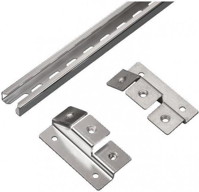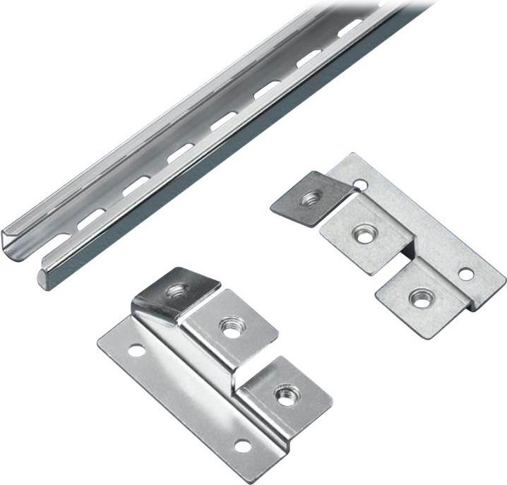 Zur Zugentlastung bei der Kabeleinführung. Die Länge der Kabelabfangschiene ist auf die Breite der Montageplatte abgestimmt. Die im Lieferumfang enthaltenen Befestigungswinkel ermöglichen drei verschiedene Einbausituationen auf der Montageplatte.