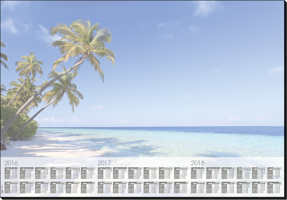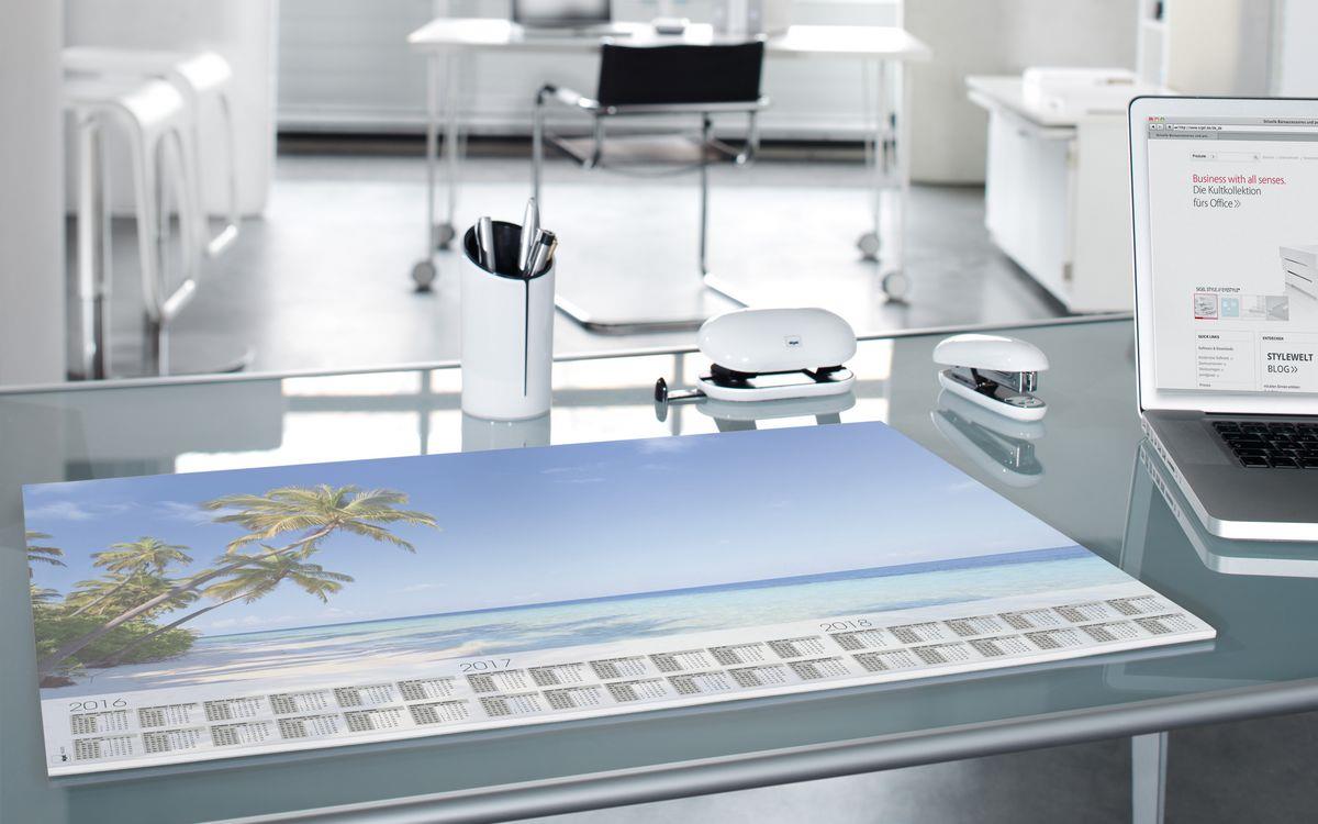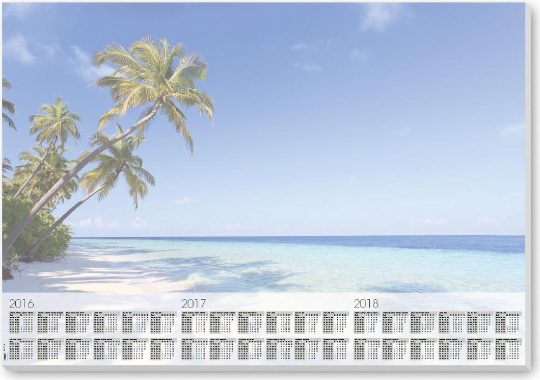 Ansprechende Schreibunterlage "Beach" mit Urlaubsmotiv, mit aktuellem 3-Jahres-Kalendarium, in hoher Papierqualität (80 g/m ) mit 30 Blatt, im Format 595x410 mm. Viersprachig in Deutsch, Englisch, Französisch und Niederländisch. Die stabile Leimung an der Unterkante und partiell an der Oberkante verhindert zuverlässig ein Umknicken der Ecken. Sichere Planlage durch stabilen Rückendeckel.