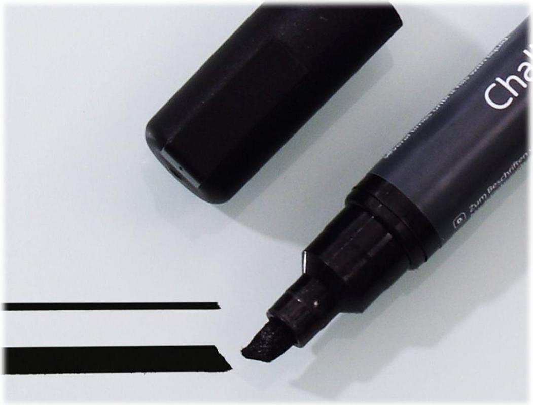 Der schwarze Kreidemarker 50 mit Keilspitze 1-5 mm mit besonders hoher Deckkraft ist für die Anwendung auf glattem Glas und fast allen geschlossenen Oberflächen geeignet. Die Flüssigkreide auf Wasserbasis kann trocken und feucht abgewischt werden.