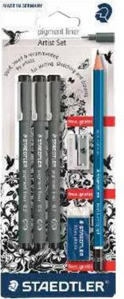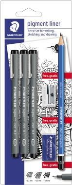 STAEDTLER Pigmentliner Set, schwarz, Blisterkarte lange Metallspitze ideal für Lineale und Schablonen, - 1 Stück (308 SBK3P)