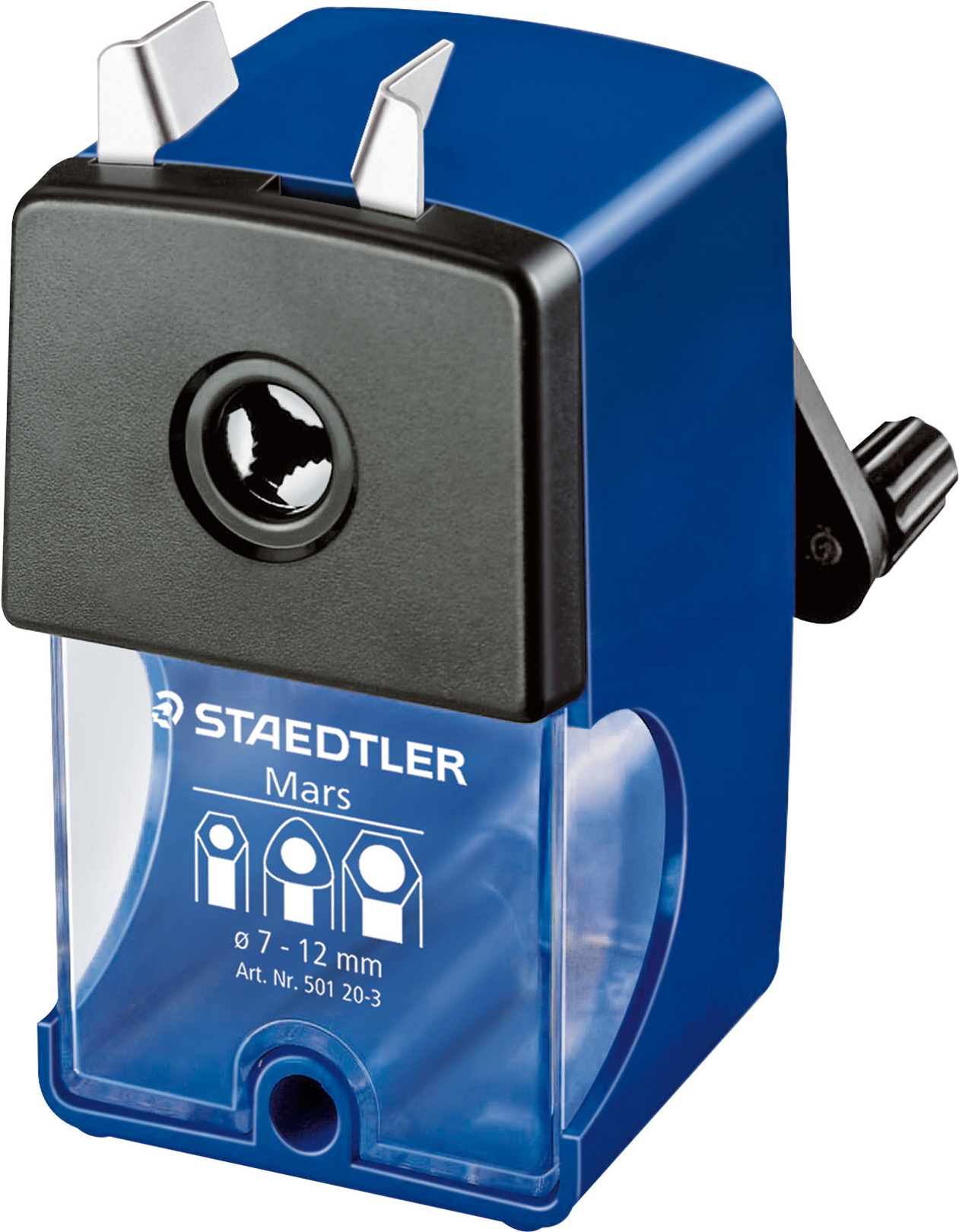 STAEDTLER Mars Spitzmaschine ist perfekt für alle runden, drei- und sechskantigen Blei- und Farbstifte bis 12 mm Durchmesser. Ihr Spitzkonus hat verschiedene Einstellungsmöglichkeiten: lang und spitz - ideal für klare und akkurate Linien - kurz und stumpf - ideal für satte und weiche Abstriche.