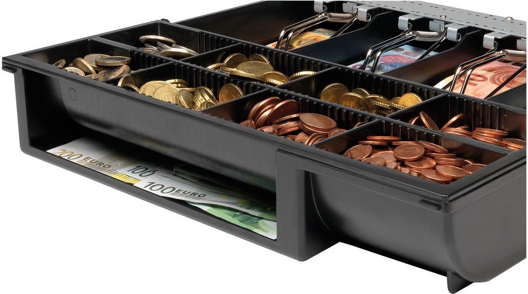 Schützen Sie das Bargeld in Ihrem 4141T1 Kassenladen-Einsatz während Schichtwechseln und der Aufbewahrung in Ihrem Tresor. Schieben Sie einfach den robusten Stahldeckel 4141L auf die Kassenlade und schließen Sie sein Schloss ab. In Kombination mit dem bruchsicheren PVC des 4141T1 macht der 4141L einen Zugriff auf Ihr Geld durch Diebe fast unmöglich.