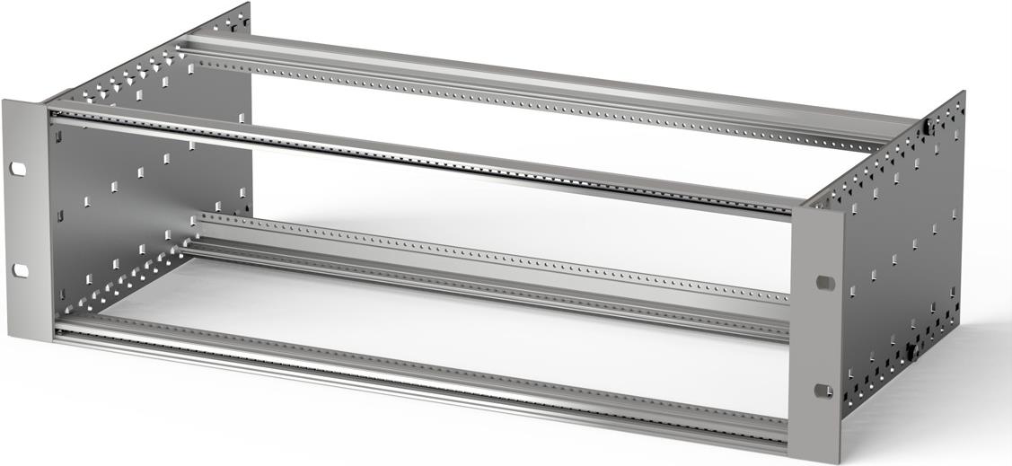 48,26 cm (19"")-Baugruppenträger, 3HE, 84TE. Lieferung als Bausatz, zum Teil vormontiert. Die rückwärtigen Modulschienen sind für die Steckverbindermontage (IEC 60603-2/DIN 41612) ...