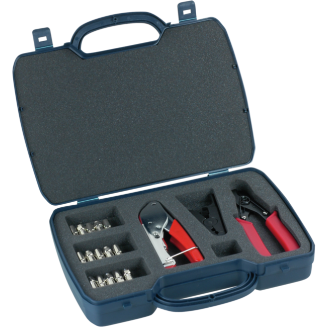 Dieses SCHWAIGER® Montage Set besteht aus insgesamt 18 Teilen. Die Kompressionstechnik rt eine schnelle und sichere Verbindung von Kabel mit Steckern. Zudem ist durch diese exzellente Technik eine sehr hohe Schirmungseigenschaft, bis zu 120 dB, gegeben.