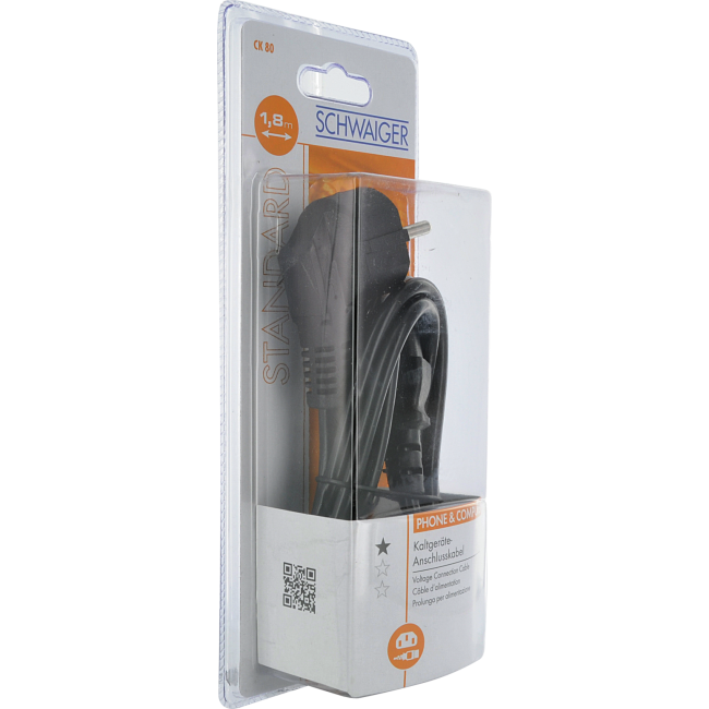 Dieses SCHWAIGER Stromversorgungskabel dient dem Anschluss von Geräten mit einem dreipoligen Kaltgeräteanschluss.