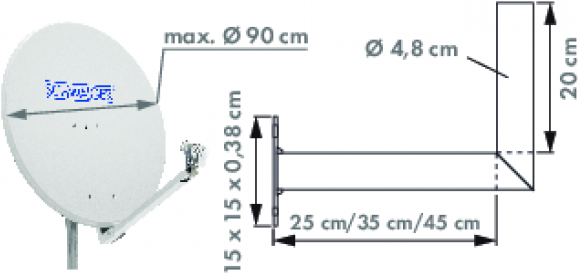 Der SCHWAIGER Wandhalter eignet sich für die Befestigung von Offset Antennen. Er ist dynamisch geprüft und mit dem TÜV Siegel zertifiziert. Der Wandhalter trägt bei einer 60 cm Offset Antenne eine Windlast bis zu 190 km/h, bei einer 75 cm Offset Antenne bis zu 180 km/h und bei einer 85 cm Offset Antennen bis zu 170 km/h.Produkttext[/head]Zur Befestigung von Offset Antennen mit einem Durchmesser von bis zu 90 cm[head]Hauptmerkmale