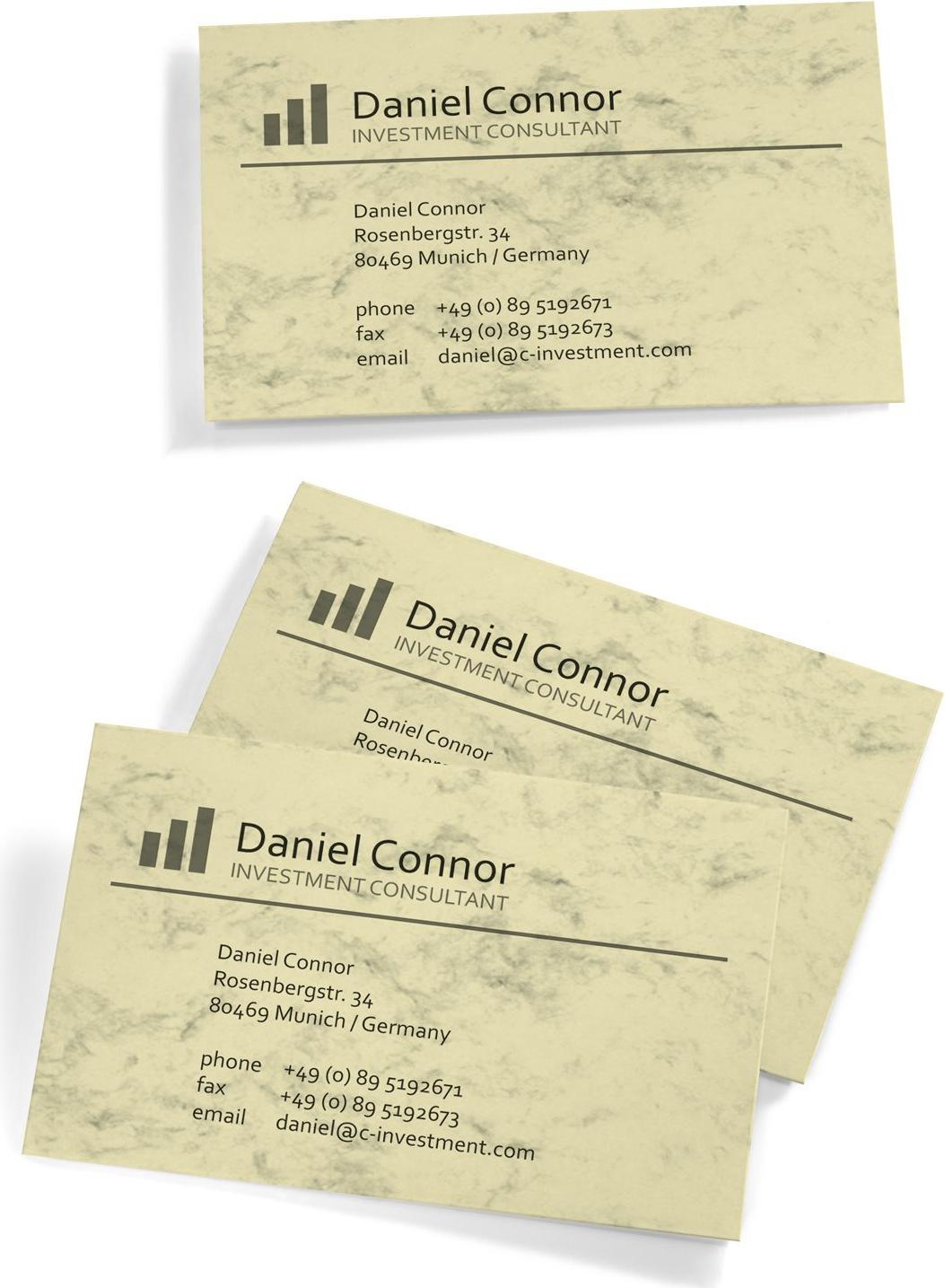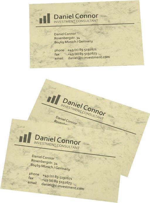 Stilvolle PC-Visitenkarten mit beidseitiger Marmor-Struktur, Farbe beige, und einer Grammatur von 225 g/m2, FSC -zertifiziert, sind ideal zum schnellen und einfachen Gestalten und Drucken am eigenen PC und Drucker. Einfaches Heraustrennen durch 3C-Technologie: glatter Schnitt rundum ohne Perforation. Die Visitenkarten sind vielseitig einsetzbar beispielsweise für Events, Messen oder geschäftlichen und privaten Kontaktaustausch. Für alle InkJet- und (Farb-)Laser-Drucker sowie Kopierer geeignet. In der Packung sind 10 Blatt DIN A4 bzw. 100 Karten im Format 85x55 mm enthalten.