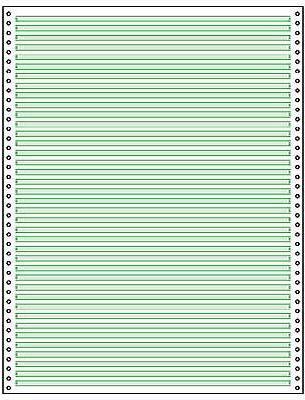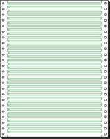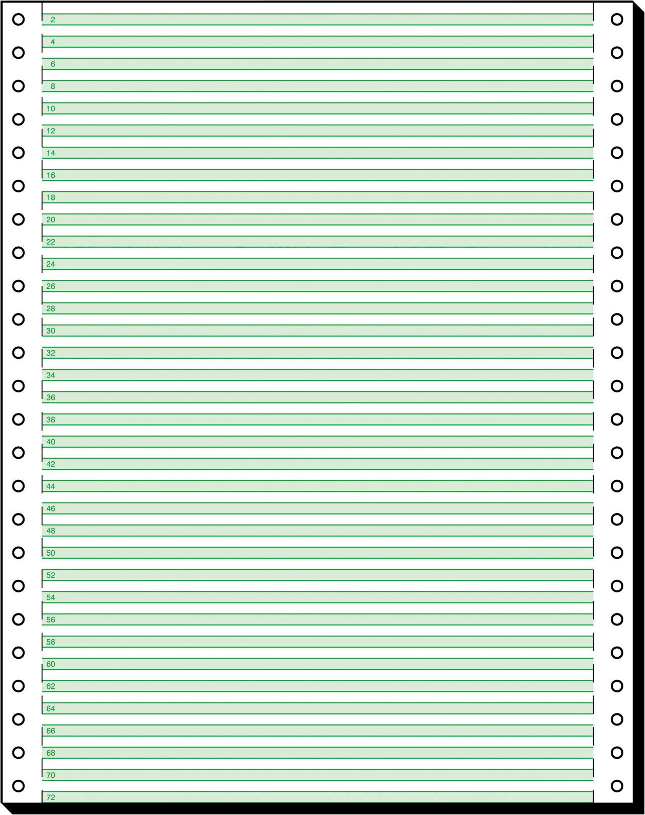 DIN-Computerpapier endlos im Format 12" x 240 mm (= A4 hoch) in einfacher Ausführung, und mit grünen Lesestreifen im Abstand 1/6" bedruckt. Holzfreies Qualitätspapier in 60 g/m und eine moderne Fertigungstechnik garantieren eine absolut störungsfreie Verarbeitung in jedem Matrix-/Nadel-Drucker. Durch die beidseitige Längsperforation lässt sich der Führungslochrand leicht abtrennen. Im Lieferumfang sind 2.000 Blatt pro Karton enthalten.
