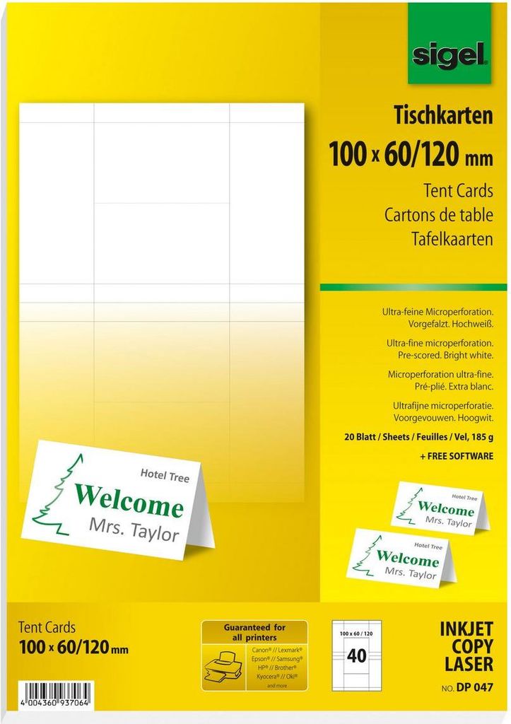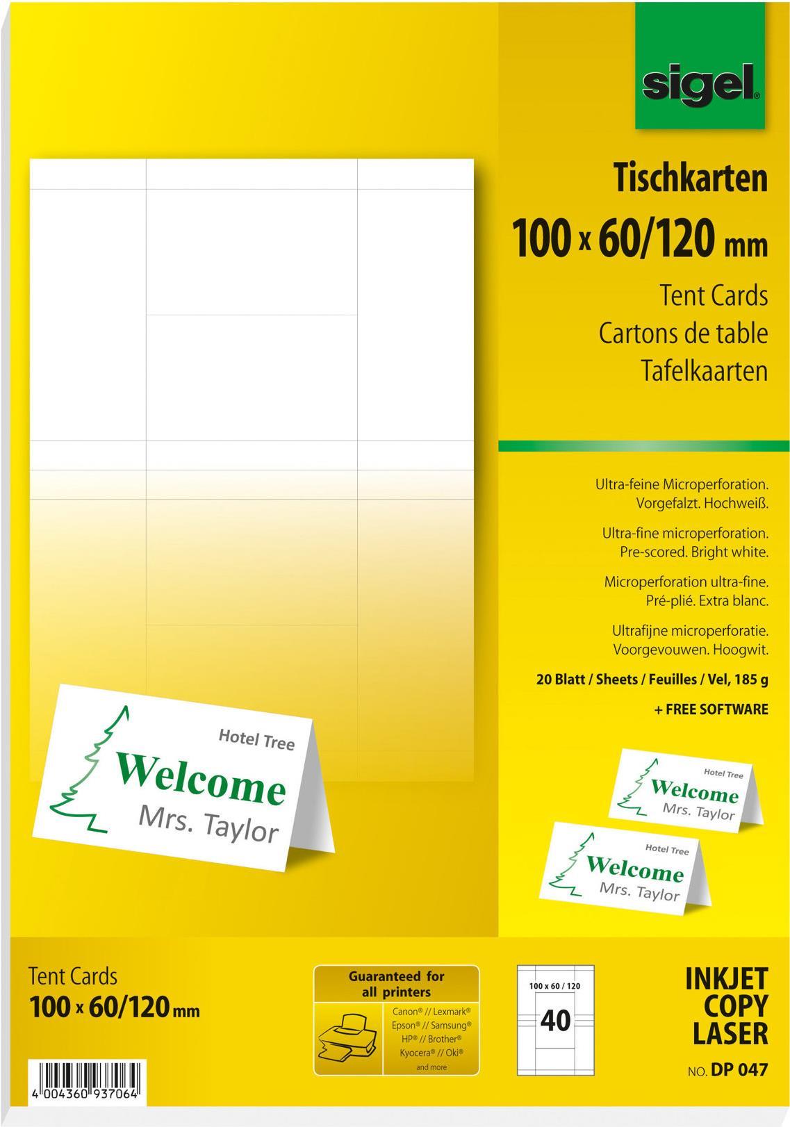 Vielseitig verwendbare PC-Tischkarten, hochweiß, mit einer Grammatur von 185g/m in Dachform zum Selbstgestalten mit PC und Drucker. Die ultra-feine Microperforation garantiert ein leichtes Abtrennen und exakte Kanten fast wie geschnitten. Die Karten sind vorgerillt für sauberes Falten. Für alle InkJet- und Laser-Drucker sowie Kopierer geeignet. In der Packung sind 20 Blatt DIN A4 bzw. 40 Karten im Format 100x60 mm (offenes Format: 100x120 mm) enthalten. Die Tischkarten sind mit den Tischaufstellern von Sigel aus glasklarem Hartplastik verwendbar.