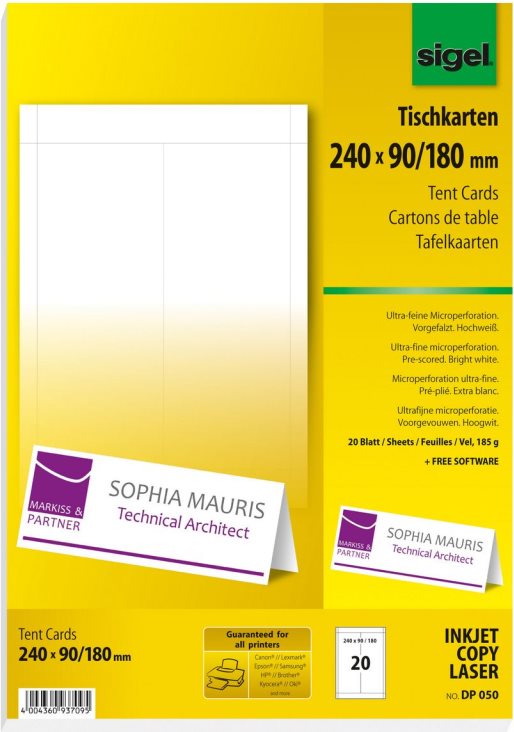 Vielseitig verwendbare PC-Tischkarten, hochweiß, mit einer Grammatur von 185g/m in Dachform zum Selbstgestalten mit PC und Drucker. Die ultra-feine Microperforation garantiert ein leichtes Abtrennen und exakte Kanten fast wie geschnitten. Die Karten sind vorgerillt für sauberes Falten. Für alle InkJet- und Laser-Drucker sowie Kopierer geeignet. In der Packung sind 20 Blatt DIN A4 bzw. 20 Karten im Format 240x90 mm (offenes Format: 240x180 mm) enthalten. Die Tischkarten sind mit den Tischaufstellern von Sigel aus glasklarem Hartplastik verwendbar.