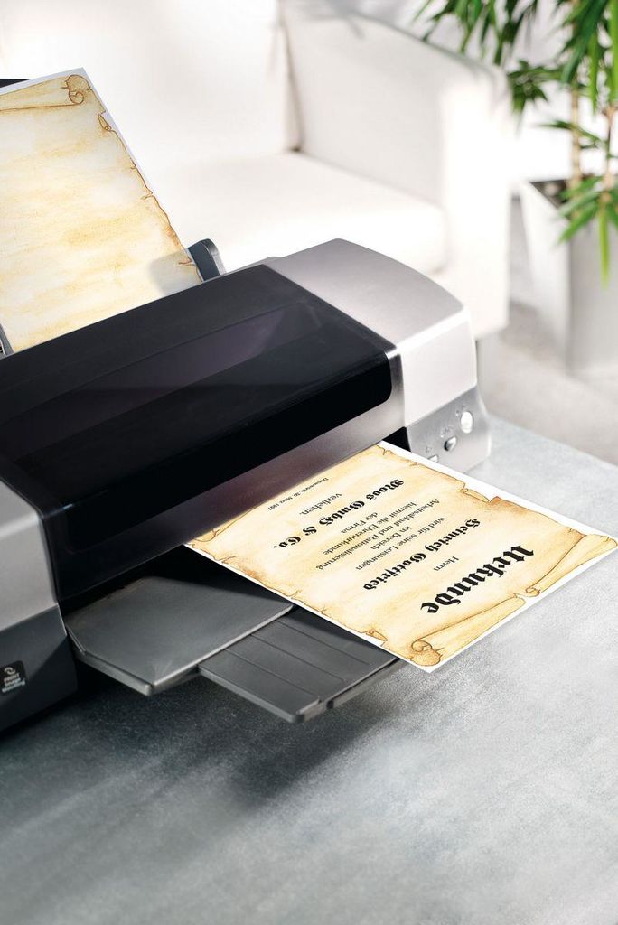 Motiv-Papier "Pergament", 90g/m -Feinpapier mit einer Pergamentrolle als Motiv, zum Bedrucken mit InkJet- und Laser-Drucker sowie zum Kopieren geeignet. Das Papier ist vielseitig einsetzbar beispielsweise als Einladung, Speise- und Menükarte, Urkunde/ Zertifikat oder Info-Aushang. Im Lieferumfang sind 50 Blatt im Format DIN A4 enthalten.