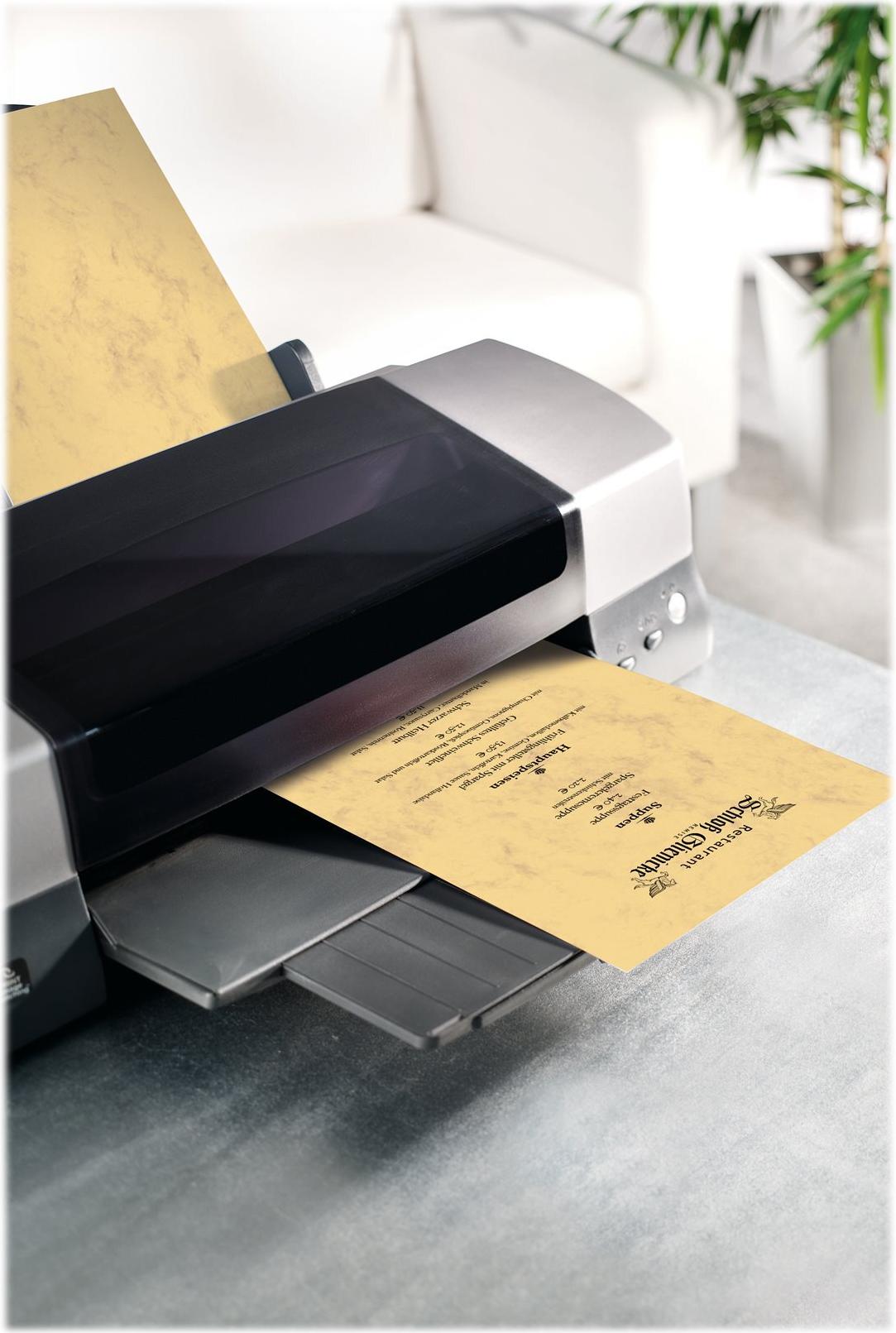 Marmor-Papier sandbraun, 90g/m -Feinpapier zum Bedrucken mit InkJet- und Laser-Drucker sowie zum Kopieren geeignet. Das Papier ist vielseitig einsetzbar beispielsweise als Brief, Einladung, Speise- und Menükarte oder Info-Aushang. Im Lieferumfang sind 100 Blatt im Format DIN A4 enthalten.