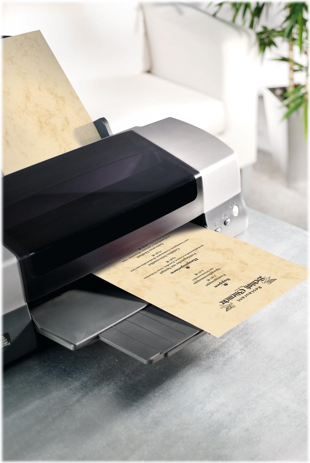 Marmor-Papier beige mit beidseitigem Motiv, 90g/m -Feinpapier zum Bedrucken mit InkJet- und Laser-Drucker sowie zum Kopieren geeignet. Das Papier ist vielseitig einsetzbar beispielsweise als Brief, Einladung, Speise- und Menükarte oder Info-Aushang. Im Lieferumfang sind 100 Blatt im Format DIN A4 enthalten.