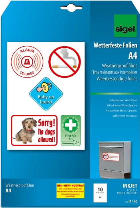 Die weißen, selbstklebenden InkJet-Folien im Format DIN A4 sind wetterfest und eignen sich perfekt für alle Arten der Innenanwendung sowie für kurzfristige Außeneinsätze. Für alle InkJet-Drucker. Packung mit 10 Blatt.