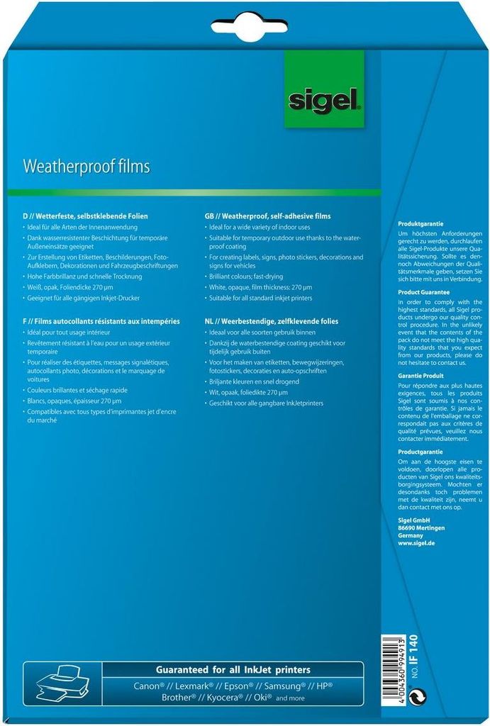 Sigel InkJet Film IF140 - Selbstklebende Folie - 150 Mikron - Opaque - A4 (210 x 297 mm) - 10 Blatt (IF140)