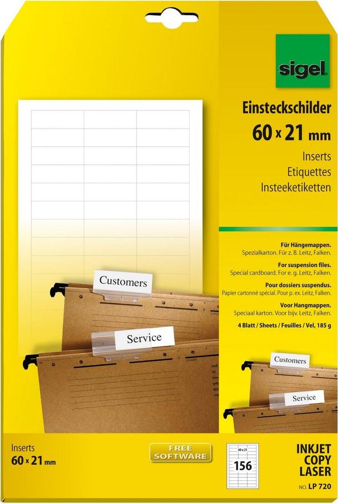 Sigel LP720 - Hängeordneretiketten - weiß - 60 x 21 mm - 185 g/m2 - 156 Stck. (4 Bogen x 39) (LP720)