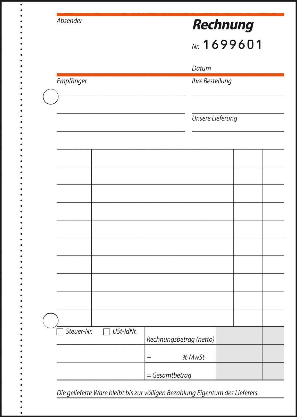 Selbstdurchschreibendes Rechnungsbuch mit vorgedruckter 7stelliger Rechnungsnummer zur eindeutigen Identifizierung. Formulare fortlaufend nummeriert, garantiert ohne Nummernwiederholung. Identische Nummerierung auf dem Original und der Kopie. Topaktuell, entsprechend der geltenden EU-Richtlinie. Jedes Blatt mit anwenderfreundlicher Abheftlochung und ultra-feiner Microperforation für leichtes und sauberes Abtrennen. Formularbuch, A6, mit 50 Formularsätzen, besonders haltbarer Spezial-Rückenleimung und integrierter Schreibunterlage zum Einklappen.