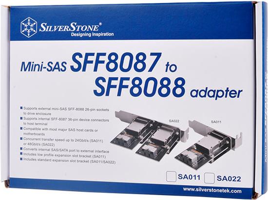 SilverStone entwickelte eine Reihe von Mini-SAS-Adaptern zur Erfüllung der Anforderungen von Servernutzern an konstante Laufwerkserweiterung. SA011 und SA022 können einen SFF-8087-Anschluss in einen SFF-8088-Anschluss verwandeln und unterstützen alle internen SAS/SATA-Schnittstellen von unterstützten Steuerkarten, Motherboards und standardmäßigen externen SAS-Adaptern basierend auf dem SFF-8087-Anschluss. Wenn der SFF-8088-Anschluss mit externen Speichergeräten wie SilverStones eigenem TS431S oder RS831S verbunden ist, kann der SA011/SA022 mühelos gleichzeitigen Zugriff auf vier oder acht Laufwerke mit hoher Bandbreite von bis zu 24 Gbit/s oder 48 Gbit/s ermöglichen.