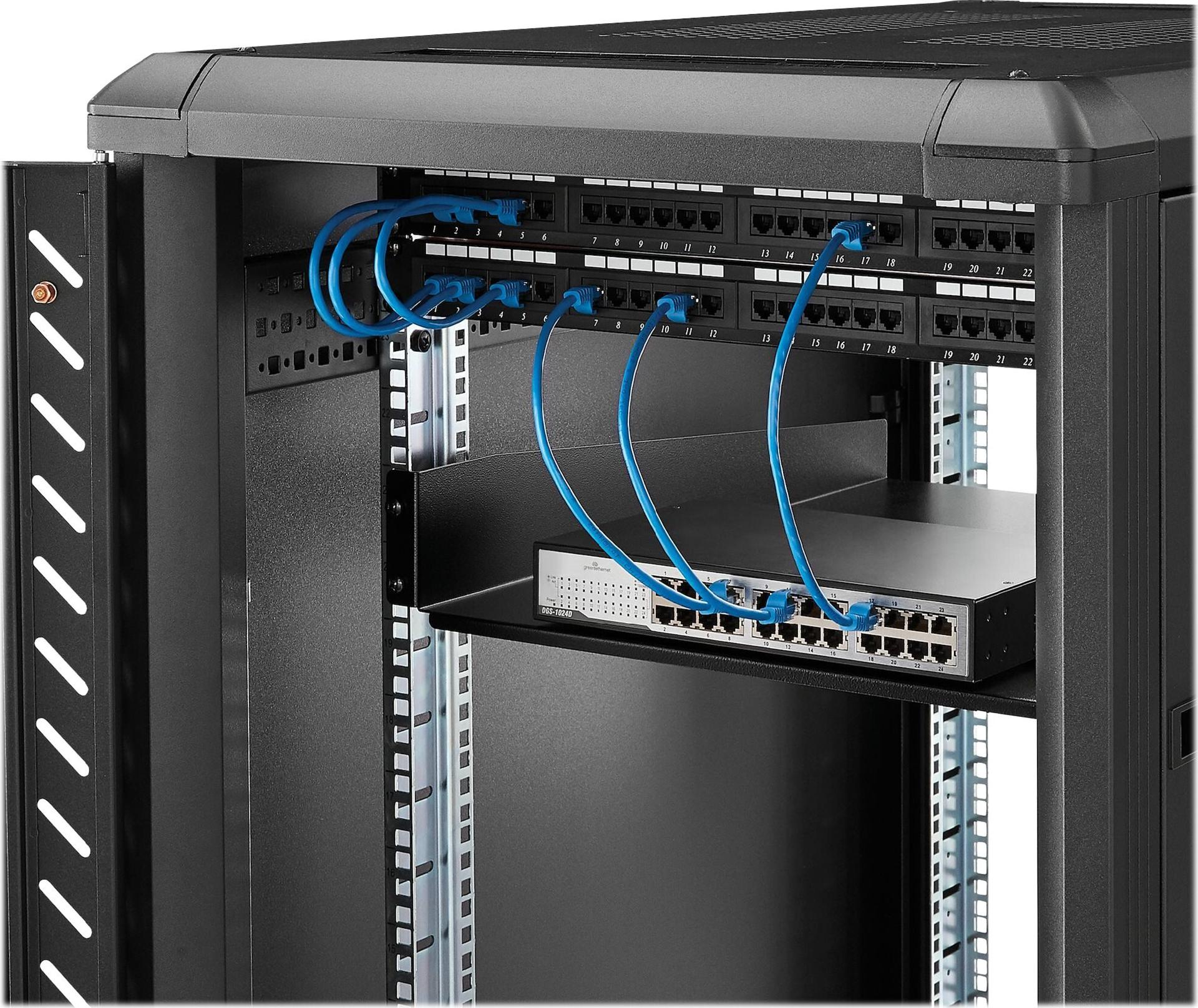 2 HE Serverschrank Fachboden - Universal Server Rack Regal für 19 Zoll Netzwerkracks und Schränke - Schwerlast - 23 kg Tragkraft - 55 cm Tiefe Ablage, Schwarz (CABSHELF22).