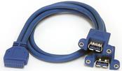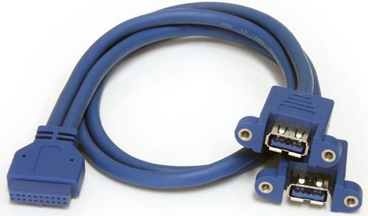 Das 2-Port USB 3.0-auf-Blendenmontage-USB-Kabel USB3SPNLAFHD verfügt über einen 20-poligen USB 3.0-Hauptplatinen-Header-Anschluss an einem Ende und teilt sich am zum anderen Ende in in zwei separate USB 3.0 A-Buchsen auf.