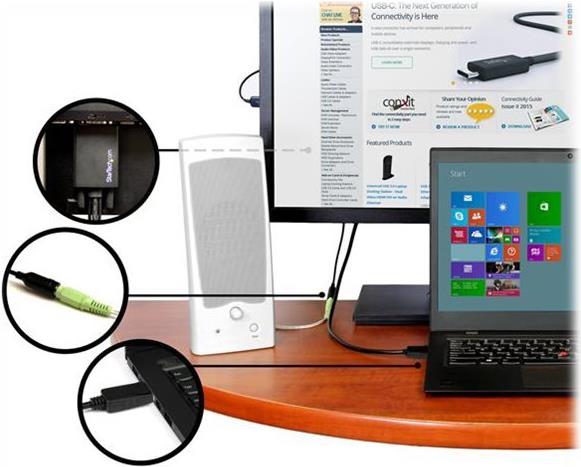 Der Adapter sorgt dafür, dass Sie überall die benötigten Verbindungen haben. Wenn der Audioanschluss an Ihrem Computer beschädigt oder blockiert ist, sorgt dieses Adapterkabel dafür, dass Ihnen trotzdem der Ton für Videopräsentationen und Musikwiedergabe zu Verfügung steht, während Sie arbeiten oder mit Ihren Kollegen über Skype chatten.